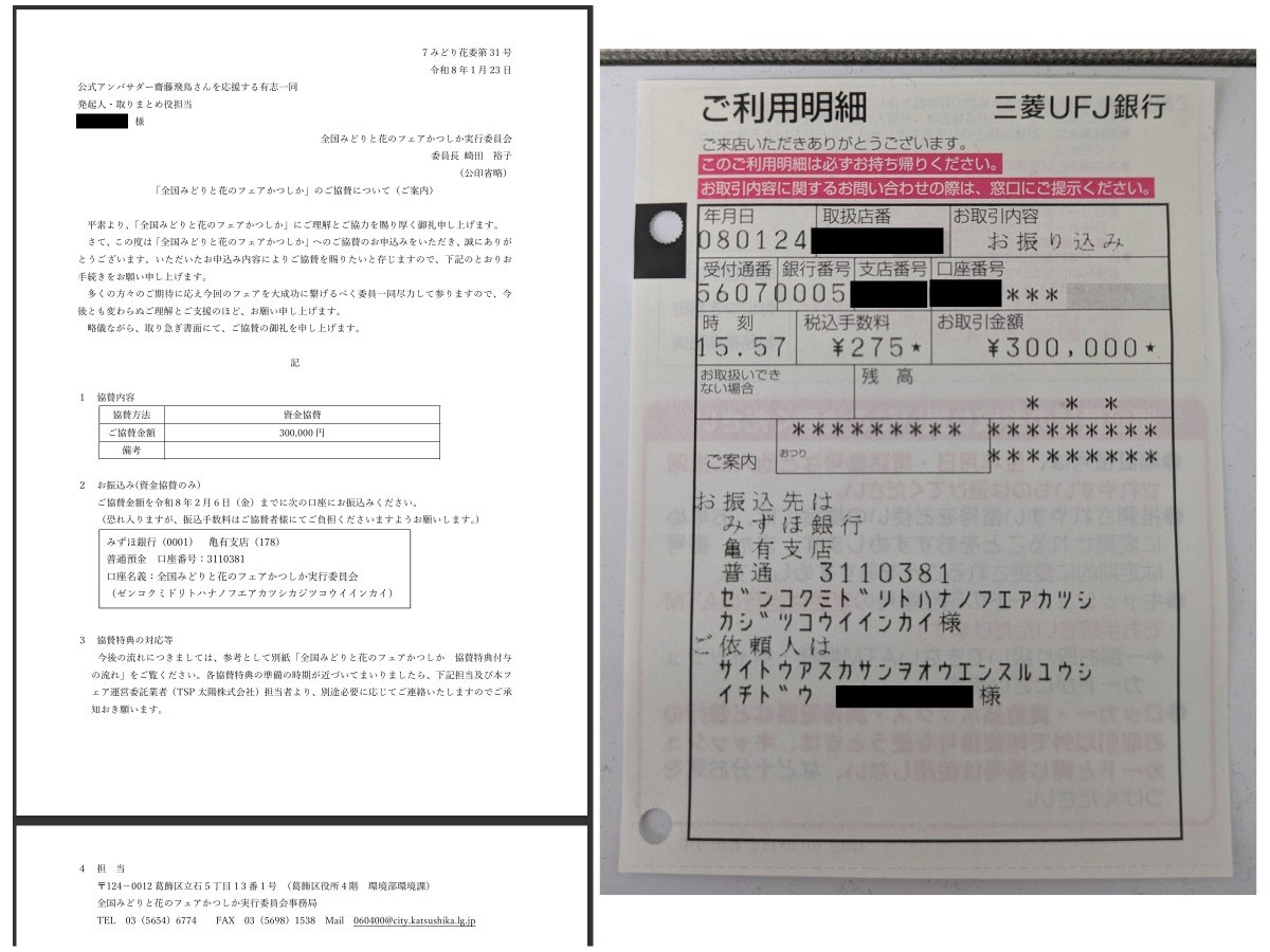 たくさんのご賛同を頂き、本当にありがとうございました。お預かりした飛鳥さんへの応援の気持ちは、きっちりと葛飾区・フェア実行委員会へお支払いするとともに、フラワースタンドはいい形に出来るよう進めて参ります。