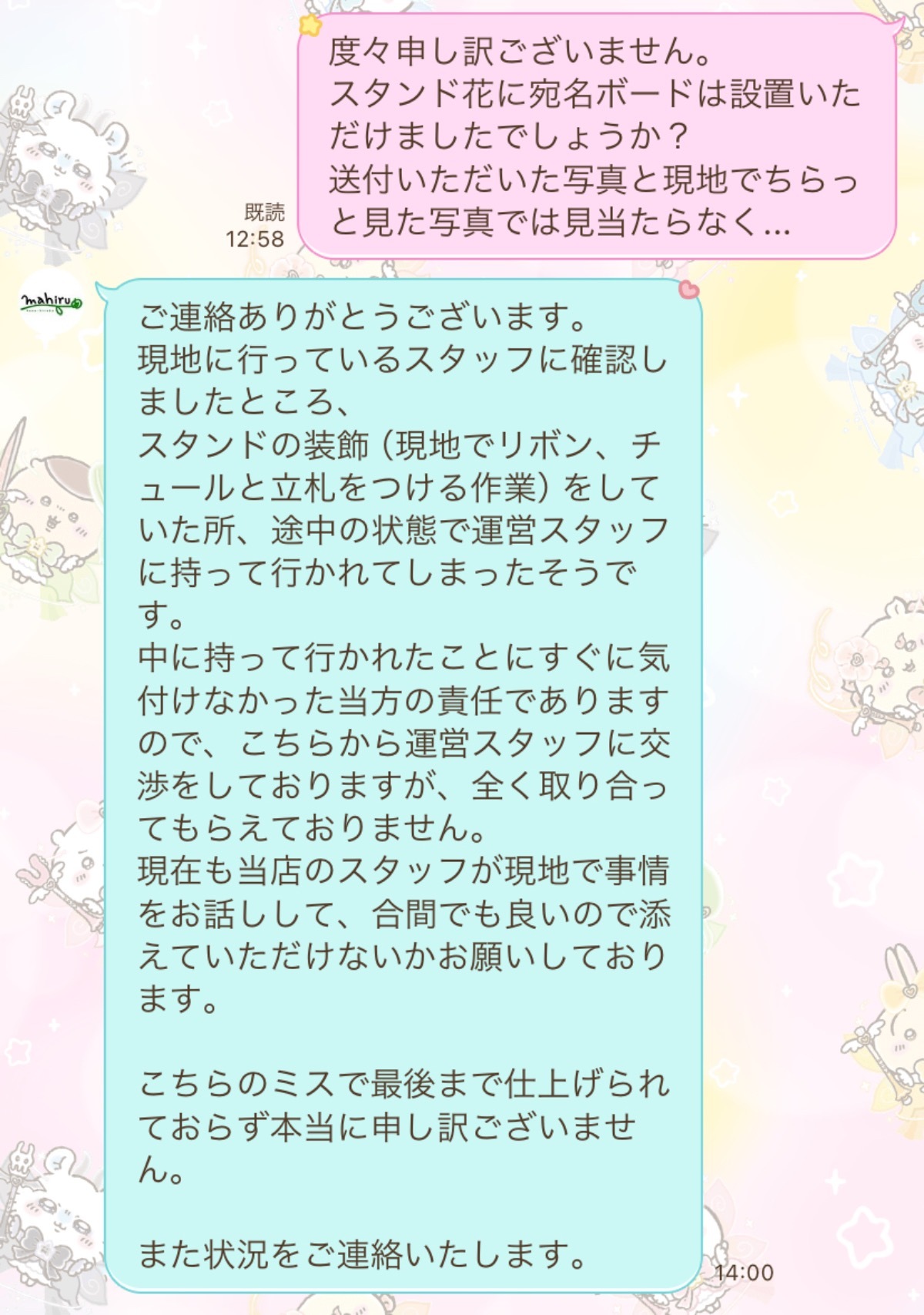 名古屋の祝花参加者ボードについてですが、現地で見ても設置されていなく、お花屋さんに問い合わせたところ参加者ボード設置前に運営スタッフに持っていかれたとのことです...