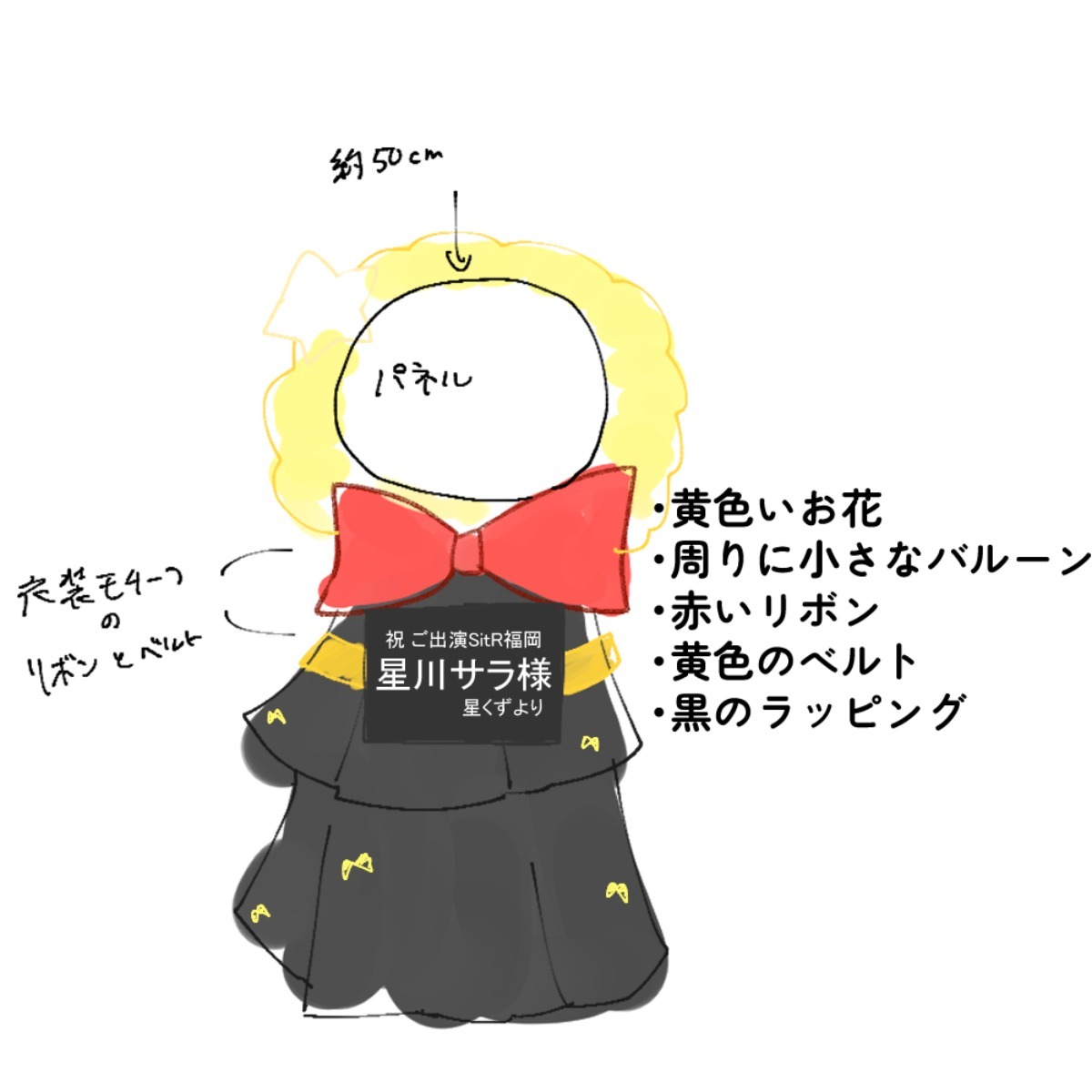 福岡公演のメインビジュアルである黒基調のお洋服から着想を得て黒のラッピング用紙を使用し、胸元にあった小さな黄色のリボン、ジャケットについているベルトを頭につけている赤いリボン、それぞれを上手く融合したデザインとなっております。