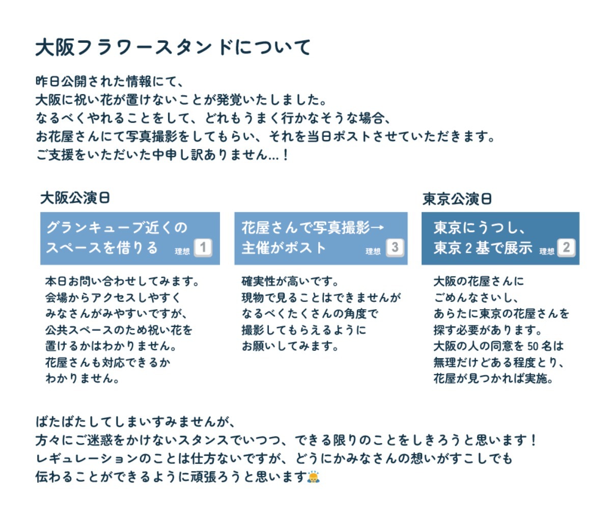 ご意見をいただいた結果、東京公演で、もともと東京に送る花とともに、大阪企画のものを送ることにいたしました。