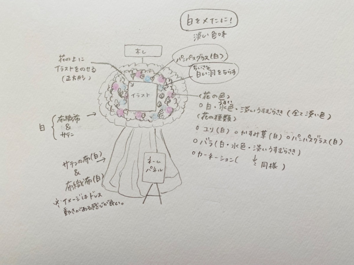 皆さまのご協力のお陰でとても素敵なお花が出来上がりました。サテンの布を加えたことでドレスのような雰囲気が出るよう工夫しました。そしてイラストの背面にはお花が透けるよう透明な額縁を使用しました。立て札の「これからも晴れ模様でありますように」は、齋藤飛鳥さん最後のソロ曲” これから ” の歌詞を参考にしてメッセージにしています。本当にありがとうございました☺️💐