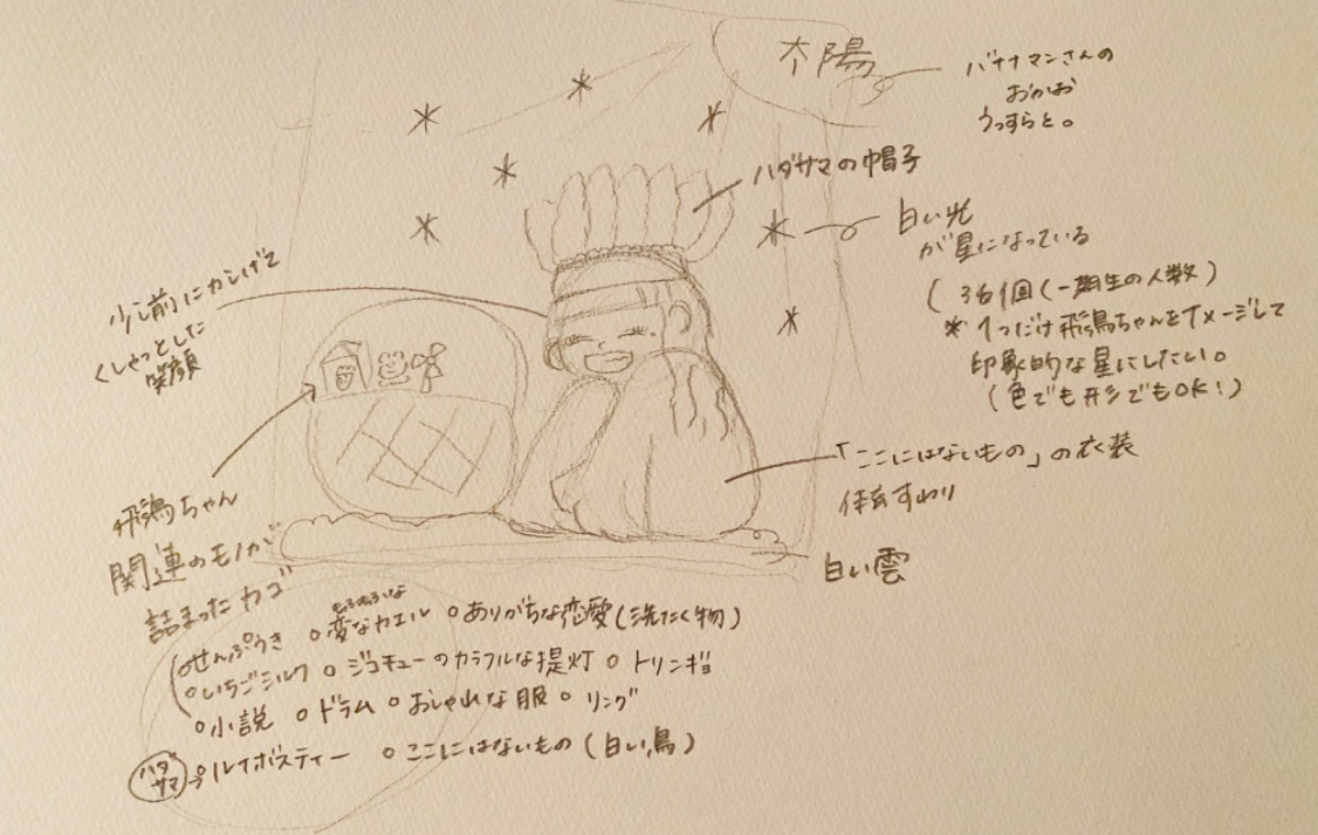 籠の中には飛鳥さんのこれまでの活動で印象に残っている物や飛鳥さんが好きな物が沢山詰まっています!太陽には、これまでずっと見守って下さっていたバナナマンさんがいたり、飛鳥さんがオリジナルメンバーを務めた楽曲”あらかじめ語られるロマンス”に掛けて共に11年を駆け抜けてきた乃木坂46一期生36人を星で表現してみました。