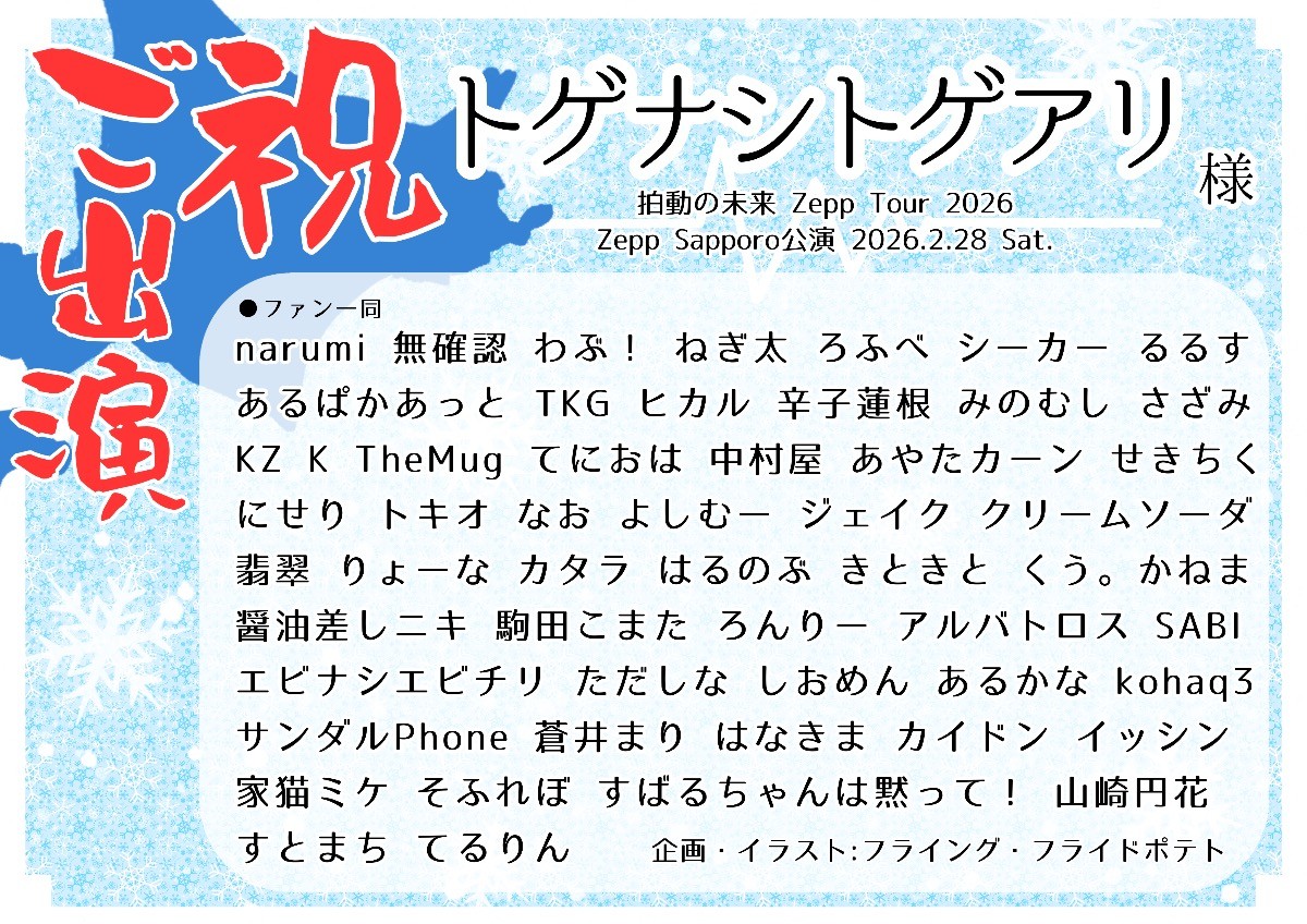 【フラスタ企画】トゲナシトゲアリ Zepp Tour 2026 拍動の未来 Zepp Sapporo公演にフラスタをお贈りしませんか?
