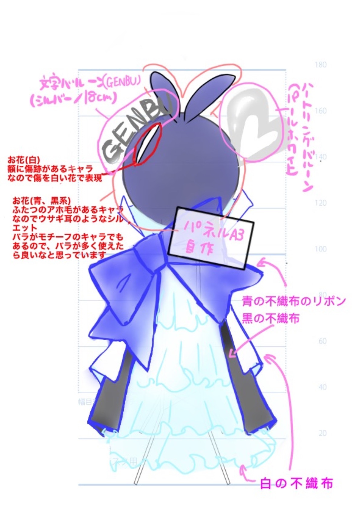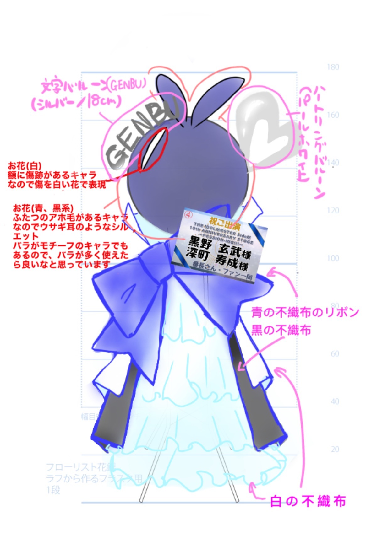 少し寂しかった足元を見直し、玄武くんの色である青、黒と神速一魂のユニットカラーである白の3色の不織布を使い豪華にしたいと考えております。