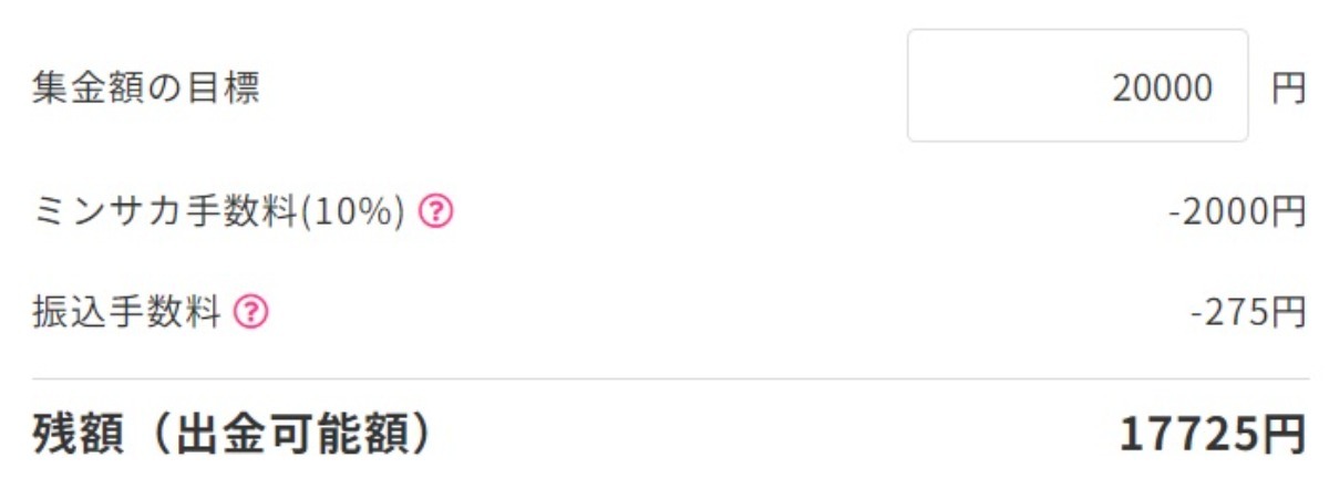 皆様からご支援いただきました20,000円から、ミンサカ手数料(10%)の2,000円とミンサカから主催へ集金額の振込に要する手数料275円を差し引いた17,725円が出金可能額となります。