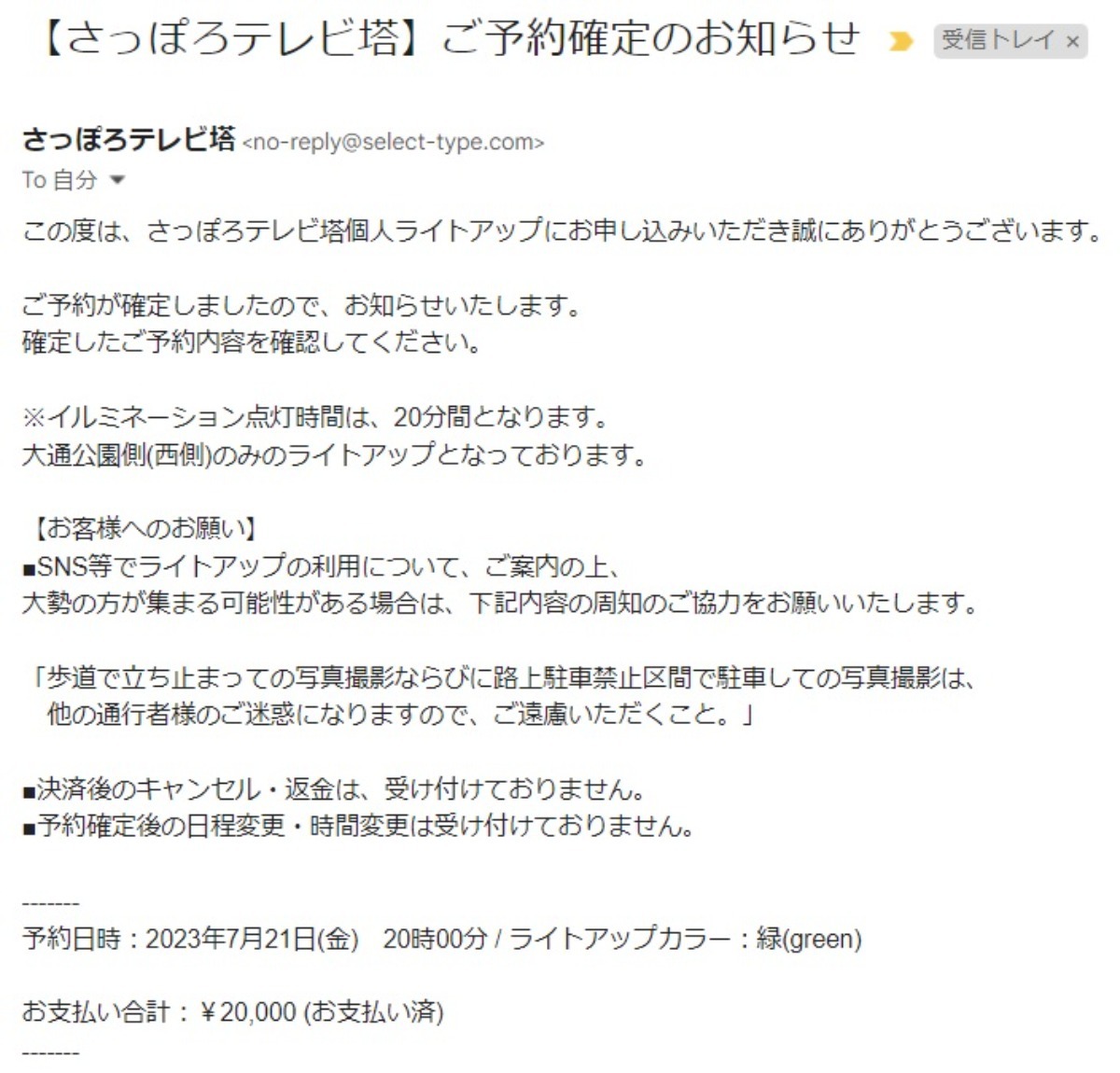 ライトアップを申し込み、予約が確定しましたので、ご報告いたします。