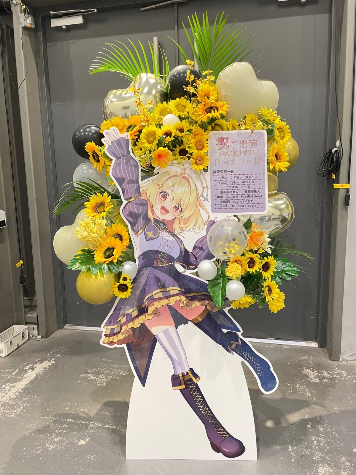 この度は、たくさんの方にご協力いただき、誠にありがとうございました。大きなかわいいイラストのパネルと、きれいで鮮やかなお花のフラワースタンドでましゅさんの初ライブ参加をお祝いすることができました。