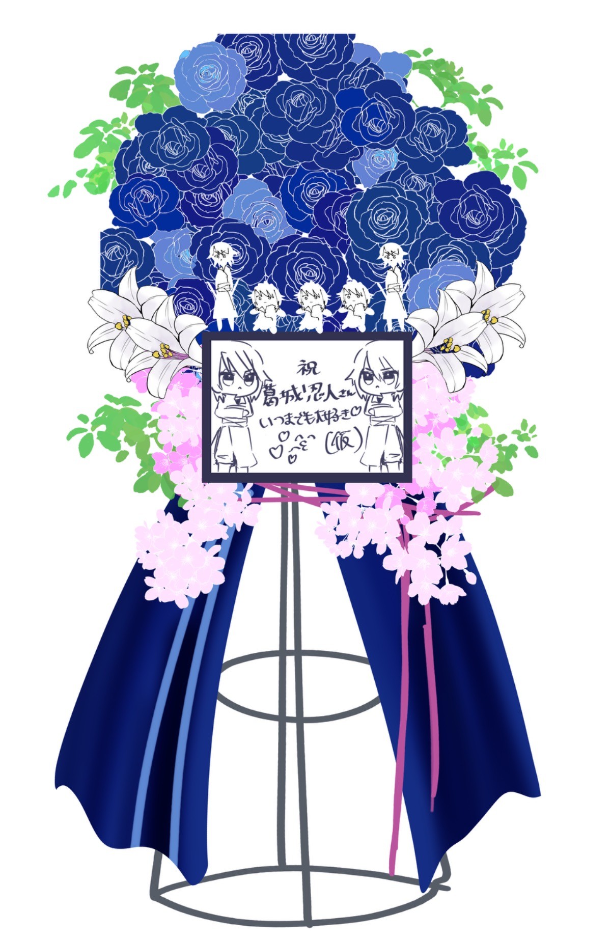 忍人さんのイメージカラーである濃藍をメインに、桜とオリエンタルリリー(季節的に造花になるそうです)を使用していただきます。