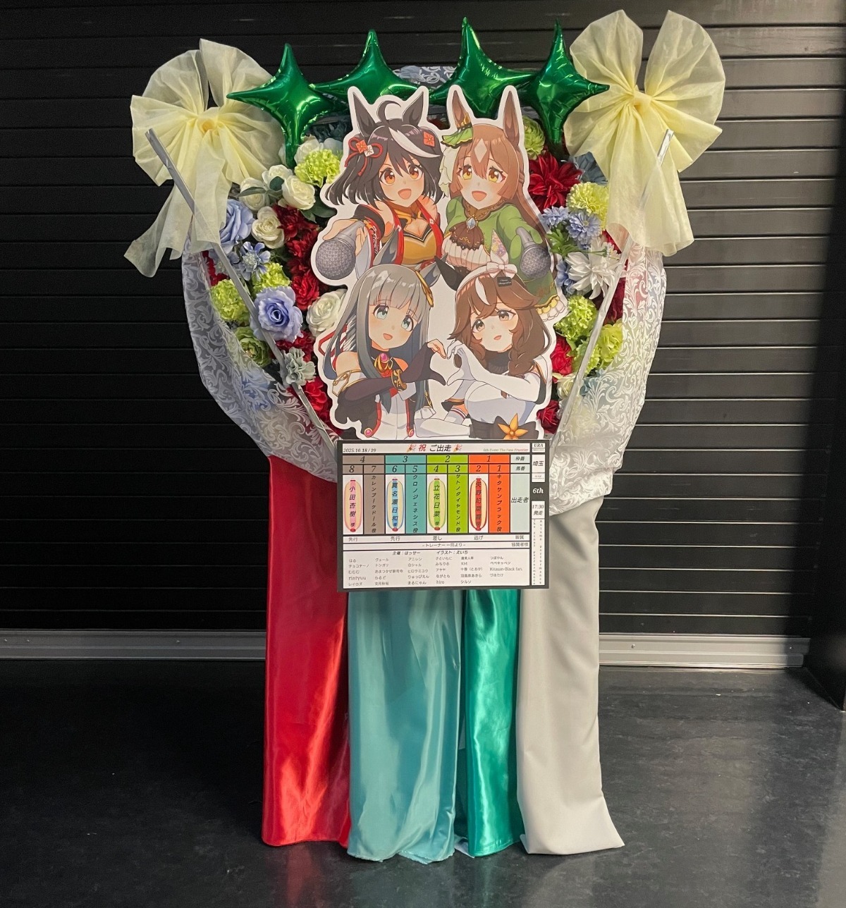 ウマ娘プリティーダービー 6th Event The New Frontier にご出走されるキタサンブラック役 矢野妃菜喜さん、サトノダイヤモンド役 立花日菜さん、クロノジェネシス役 真名瀬日和さん、カレンブーケドール役 小田杏樹さんへフラワースタンドを贈りませんか?