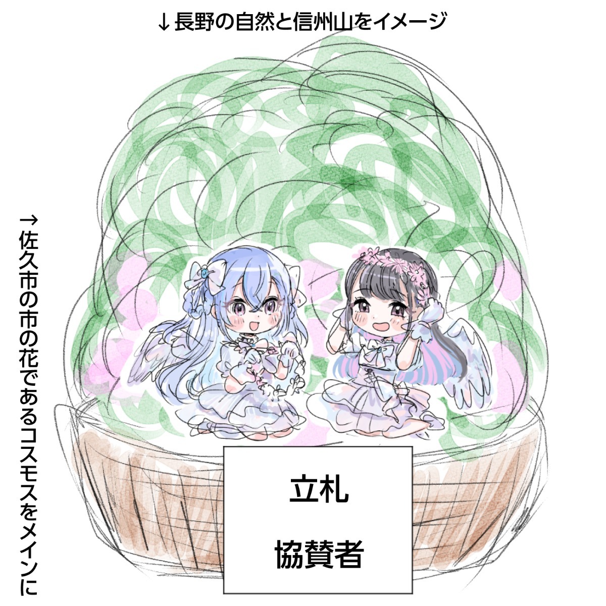 佐久市のお花である「コスモス」を中心に、長野県の雄大な自然をモチーフに制作いたしました。