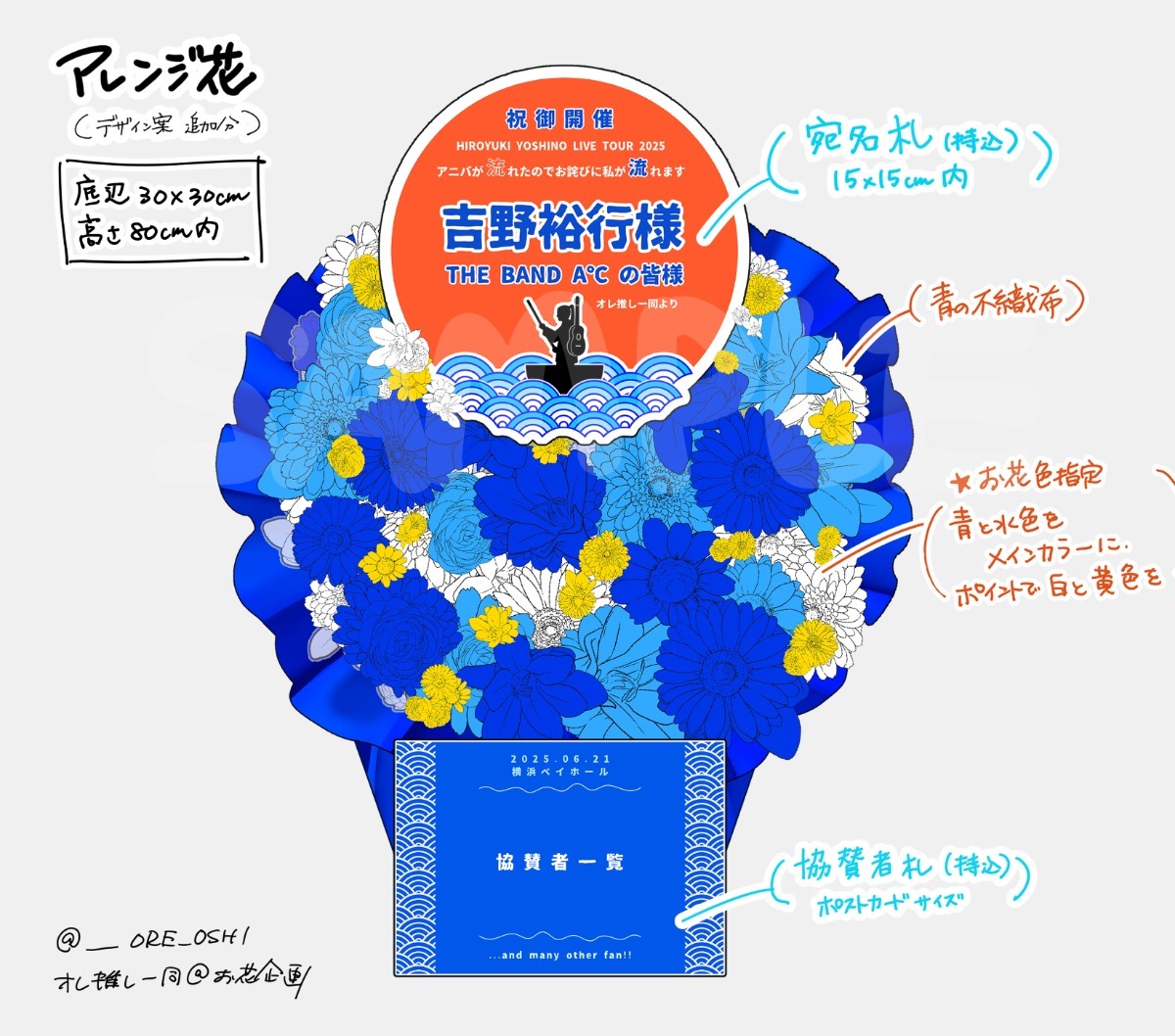 祝花は公式より受入可との告知がありましたので、企画自体はこのまま進行しても問題ないと判断いたしました。レギュレーションによって、祝花のサイズ・デザイン等が変更となる場合があります。