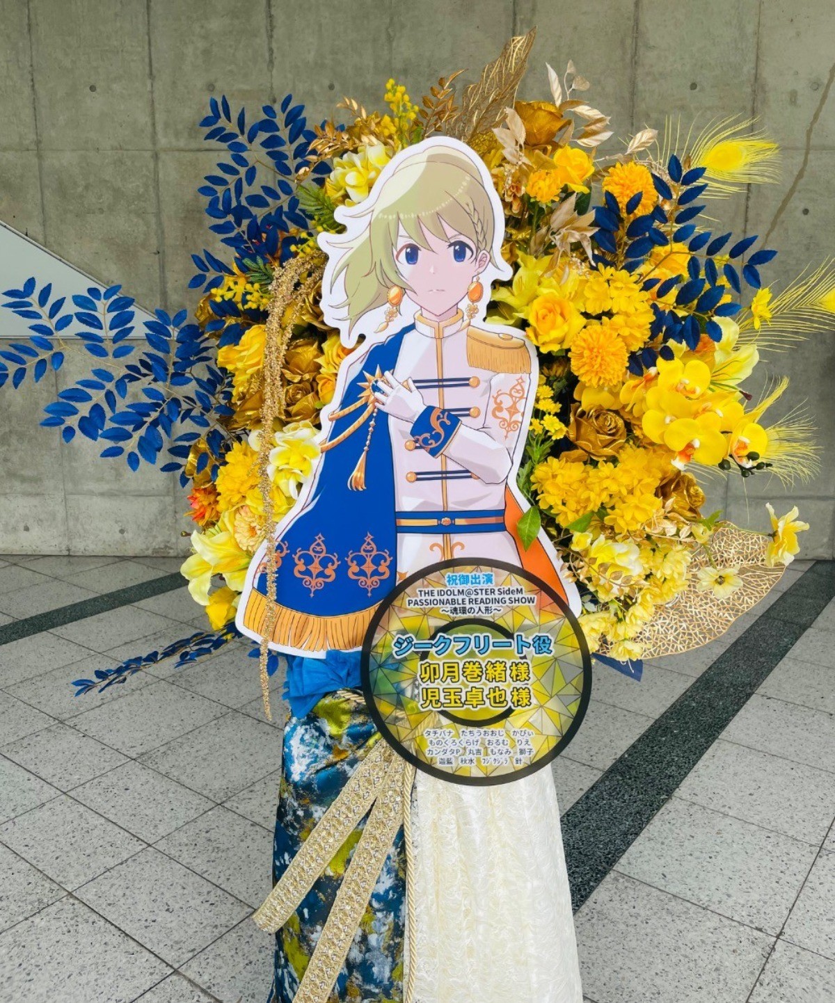 巻緒くんの個人カラーである黄色をベースに王族のカラーである青色やゴールドも取り入れていただき、華やかで上品、かつ力強さも感じるようなお花となっております。