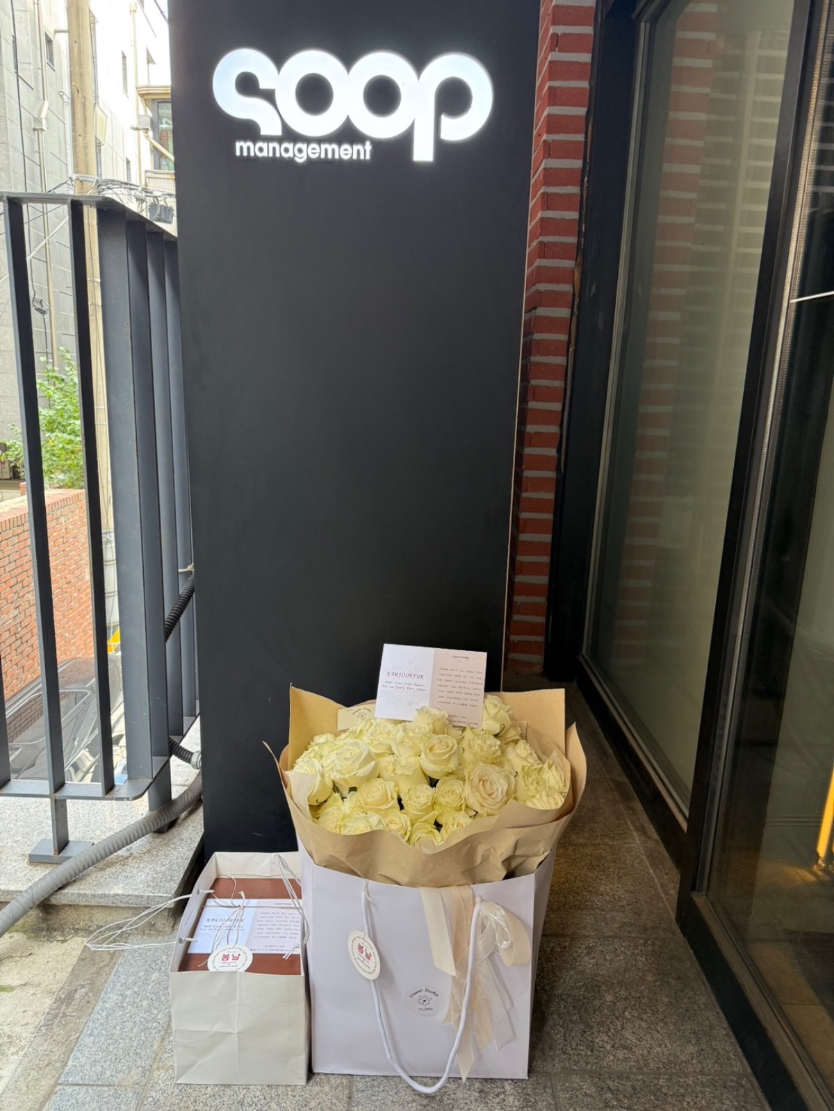 皆様からのお祝いと応援を花束と日本からのお菓子を添えて無事に事務所SOOP様にお届け完了しました。