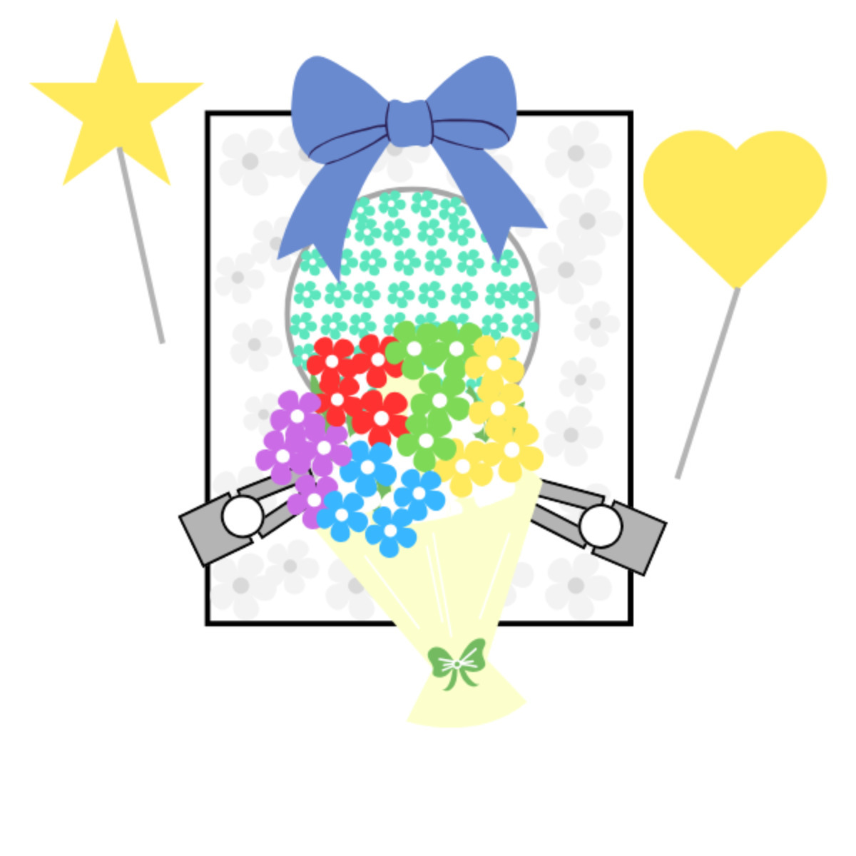バケッシュが花束を差し出しているイメージでデザインしました!