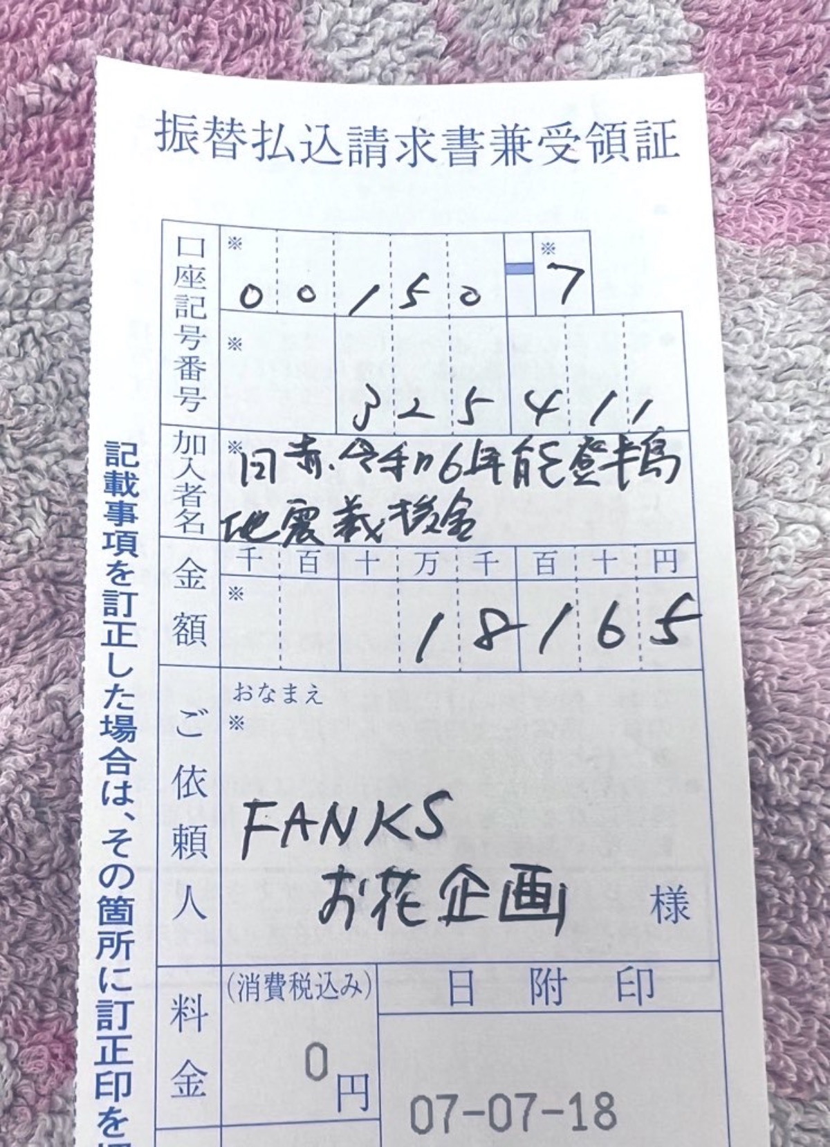 能登半島地震義援金18165円(金沢9010円+東京9155円)を日本赤十字の方に振り込ませて頂きました