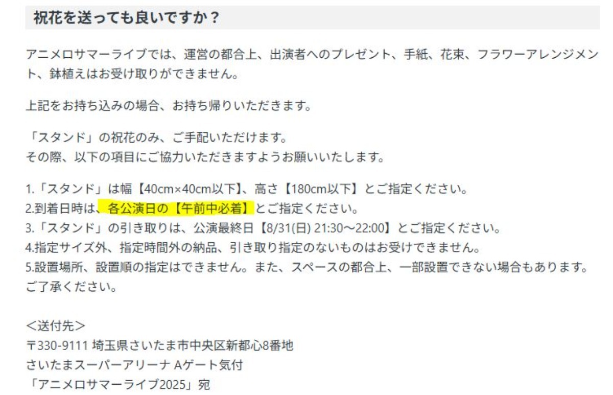 ★アニサマフラワースタンドレギュリエーションURLhttps://animelosummerlive.zendesk.com/hc/ja/articles/44366012164633--%E3%81%9D%E3%81%AE%E4%BB%96 -
