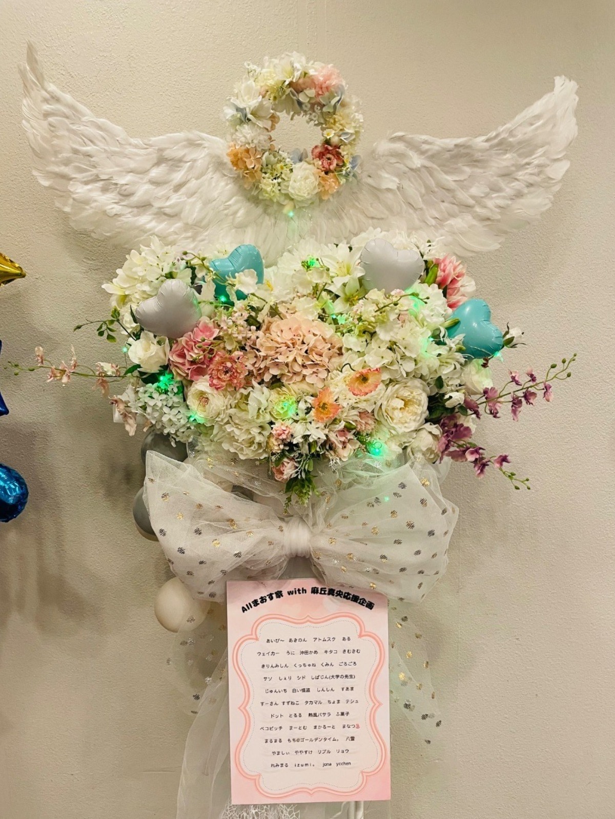 バレリーナ衣装をモチーフにした大きな天使の羽根がチャームポイントの素敵なお花に仕上がり、準備中に見に来てくれたまおちゃんがとても喜んでいたとお花屋さんからもご報告をいただきました!