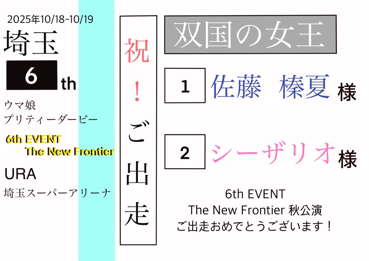 ウマ娘 6th The New Frontier 秋公演にシーザリオ役の佐藤榛夏さん、ブエナビスタ役の和泉風花さん、スペシャルウィーク役の和氣あず未さんに一緒にフラスタを送りませんか?