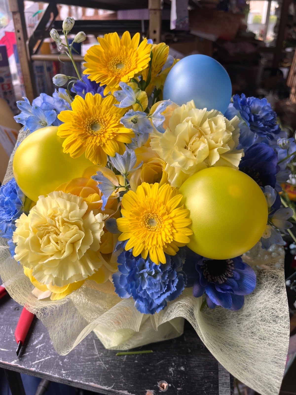 金額は5000円ほどで、お花の色は黄色と青色です。お花の種類やデザインはお花屋さんにお任せする形になりました。