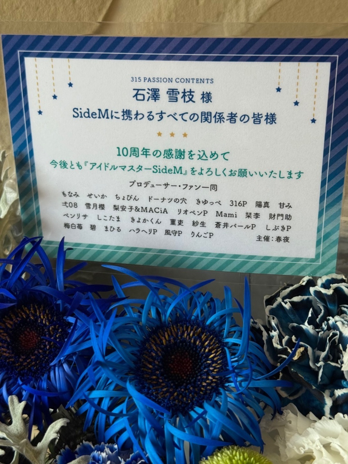 楽屋花となりますので当日現地でご覧いただくことはできませんが、石澤Pおよびスタッフの皆様へ10周年の感謝の気持ちを届けることができていれば幸いです。
