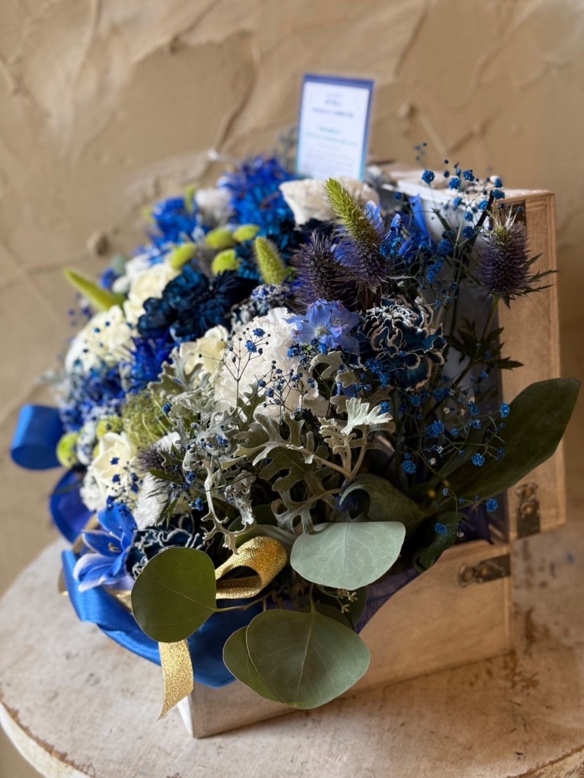 「青の濃淡、ゴールド、グリーンをベースにお作り致しました。