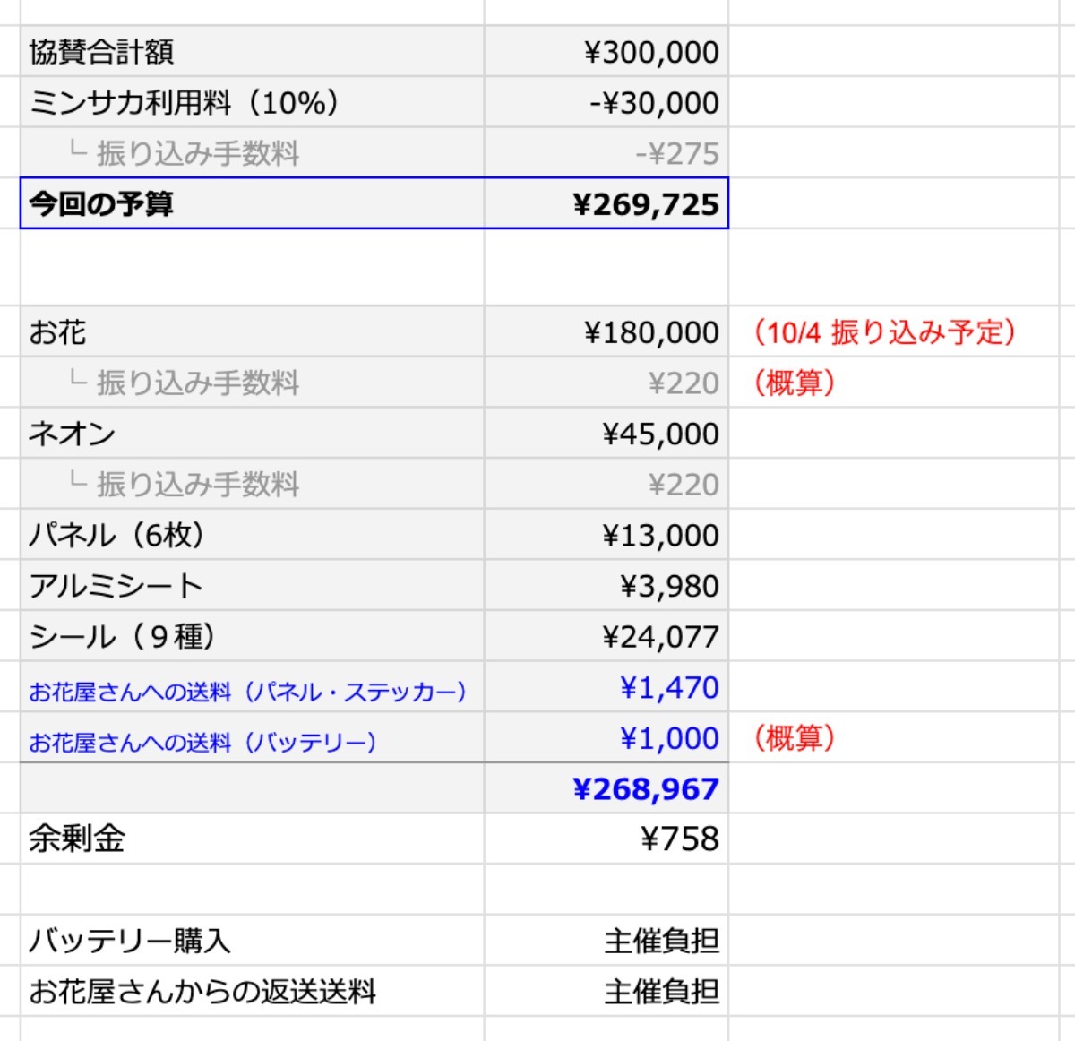 昨日お花代が確定し、今回の企画にかかった費用の全体が見えてまいりました。 まだ一部概算も含みますが、現時点での費用内訳を添付にてご報告いたします。