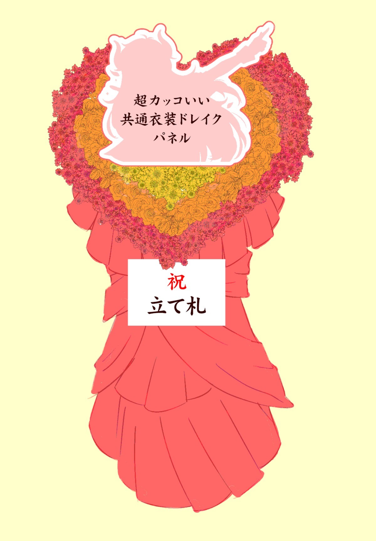 花輪の中心にはタルタル山岡先生に描いて頂いた「超カッコいい共通衣装ドレイク」をパネルとして配置する予定です。