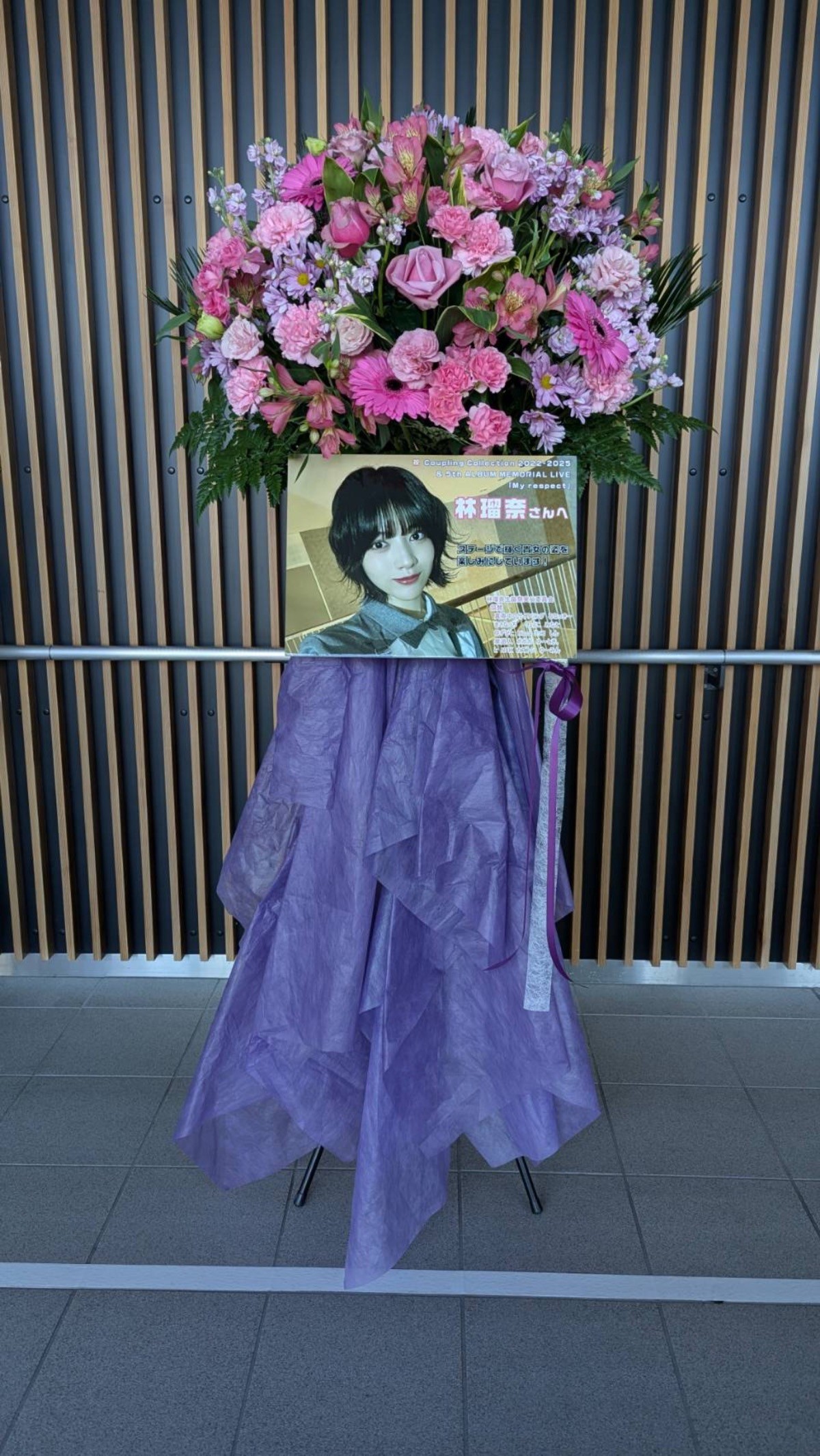 お花は林瑠奈さんのサイリウムカラーのピンクで、不織布部分は今回のアルバムのジャケットをイメージした色にしていただきました。