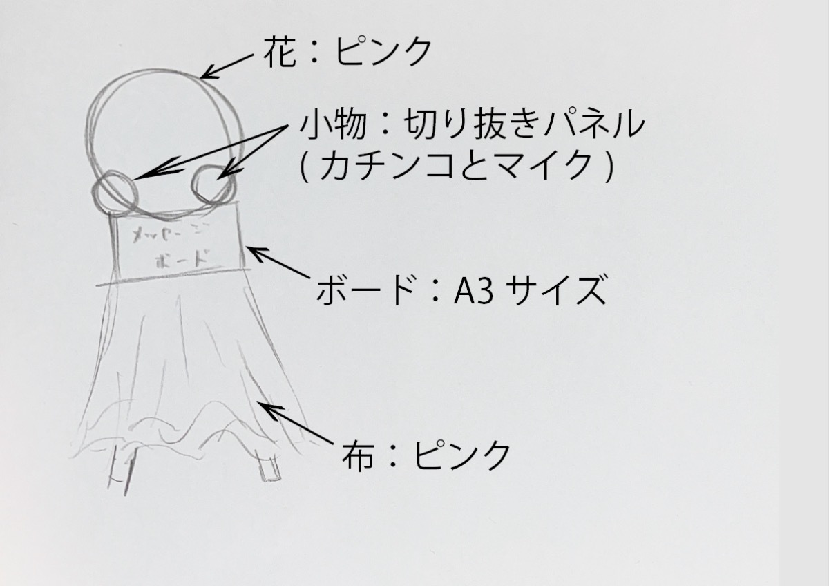 林瑠奈さんの学生としてのシンボルとして「カチンコ」と、アイドルとしてのシンボルとして「マイク」のパネルを作成し付けていただきました。 -