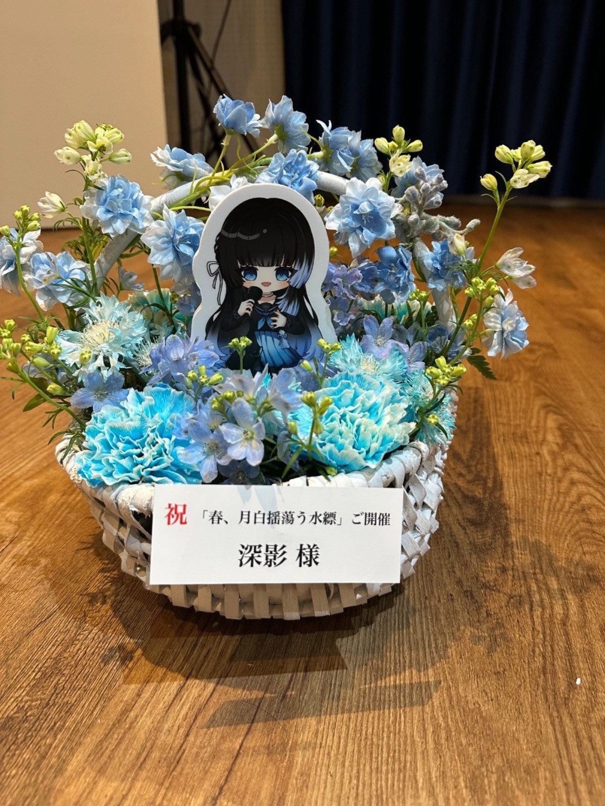 ライブということでお花でできたステージ上で歌う深影さんというコンセプトで、お花はこちらも水色を中心に鮮やかに仕上げていただきました。