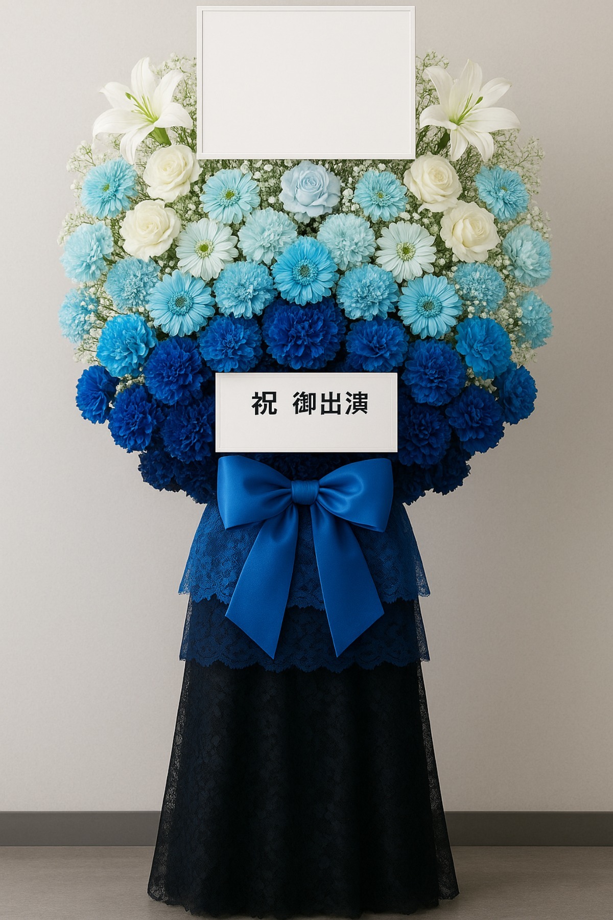 めーちゃんを基調とした水色、青、白の3色で統一感のあるフラワースタンドをお願いしてます。かすみ草も添えていただくよう要望してます。
