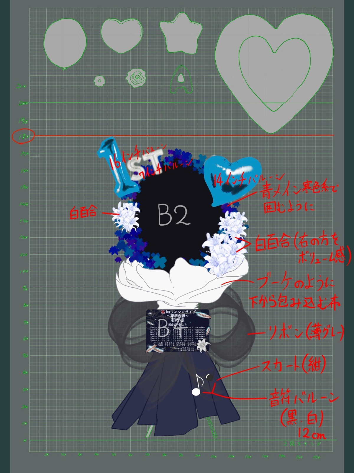 1stワンマンライブというめでたい公演をお祝いするべく、上部には青のお花と白百合。それらを包み込むようなブーケのようなイメージにてデザイナー様へお伝えいたしました!