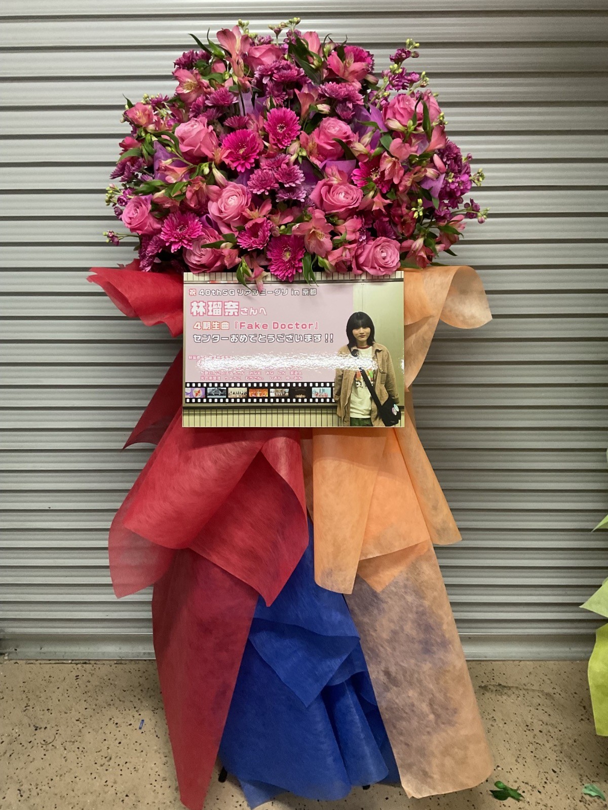 お花の色は林瑠奈さんのサイリウムカラーのピンク(濃いめ)で、不織布は4期生の期別衣装に合わせて赤、オレンジ、青を使用していただきました。