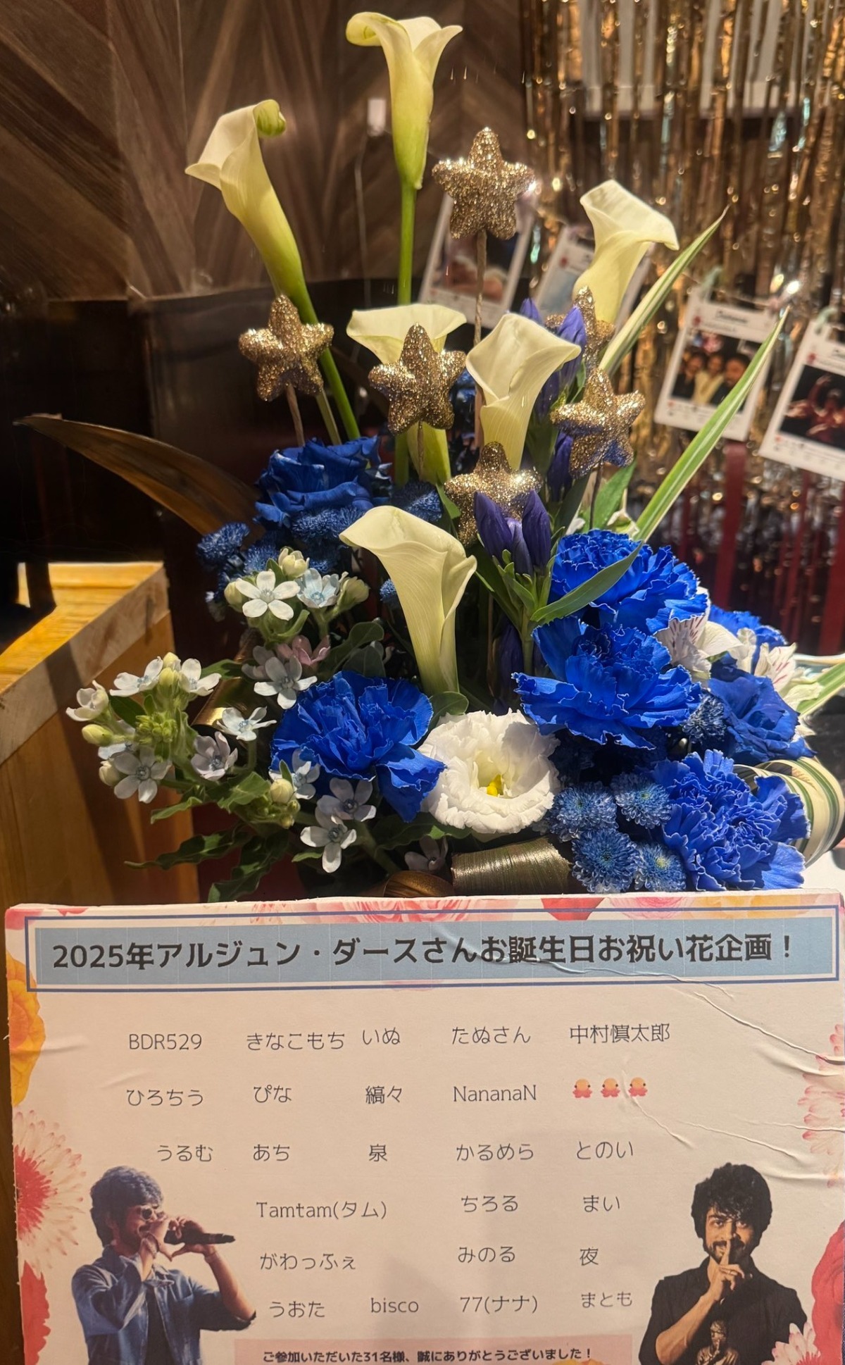 お祝い花と合わせて、参加者の方々にご持参いただいたダースさんのグッズや装飾品等で、華やかに素敵なお祝いの祭壇にできました。