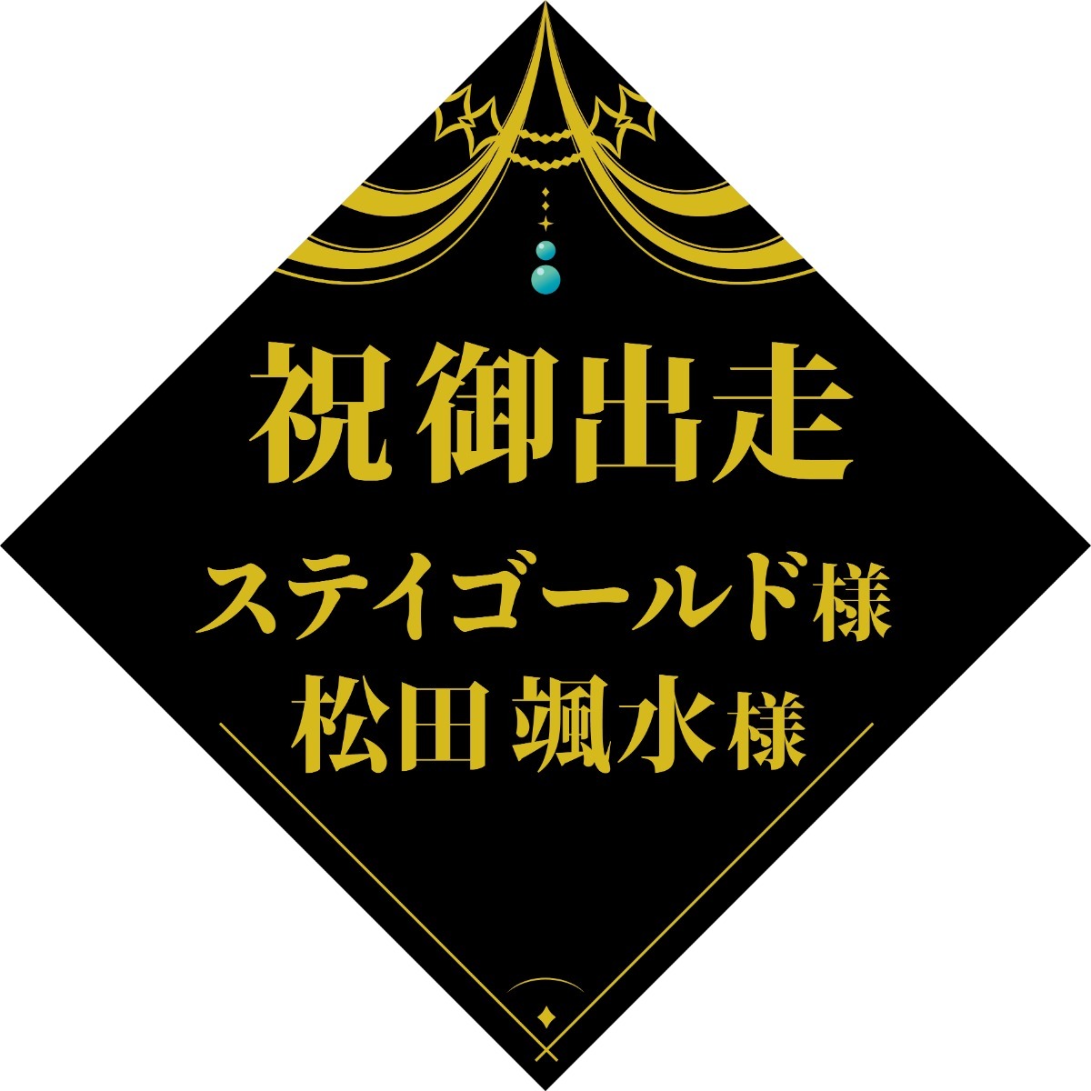 ウマ娘ステイゴールド様のイメージカラーの一部である黒と金を使用して、お祝いのお言葉と協賛者様のお名前を記載いたします。