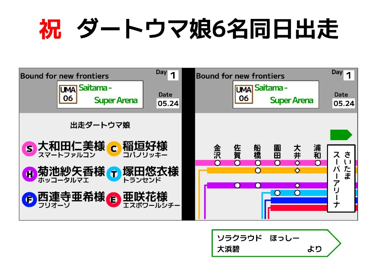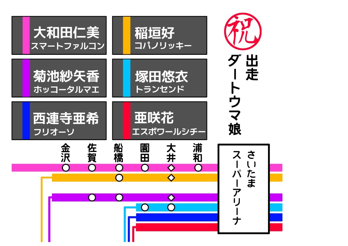 その軌跡を電車の路線図をアレンジして表現してみようというものです。地方競馬場とのコラボで上記6名のいずれかがトークショーやアナウンスにて参加されたのは浦和、船橋(アナウンスのみ)、園田、佐賀、大井(メガイルミ)、金沢の6つ。それらを駅に見立て、それぞれ出走された箇所に●印を付けてます。「大井」に関してはメガイルミの出走時期がトランセンドのみ2024年で、他3人はそれ以前に出走と分かれております。コンセプトが路線図のアレンジなので「大井」を複数にするのは適していません。そのため大井はトランセンド発表後である2024年、園田ー浦和の間とし、トランセンド以外の印を菱形とすることで差別化を図っております。