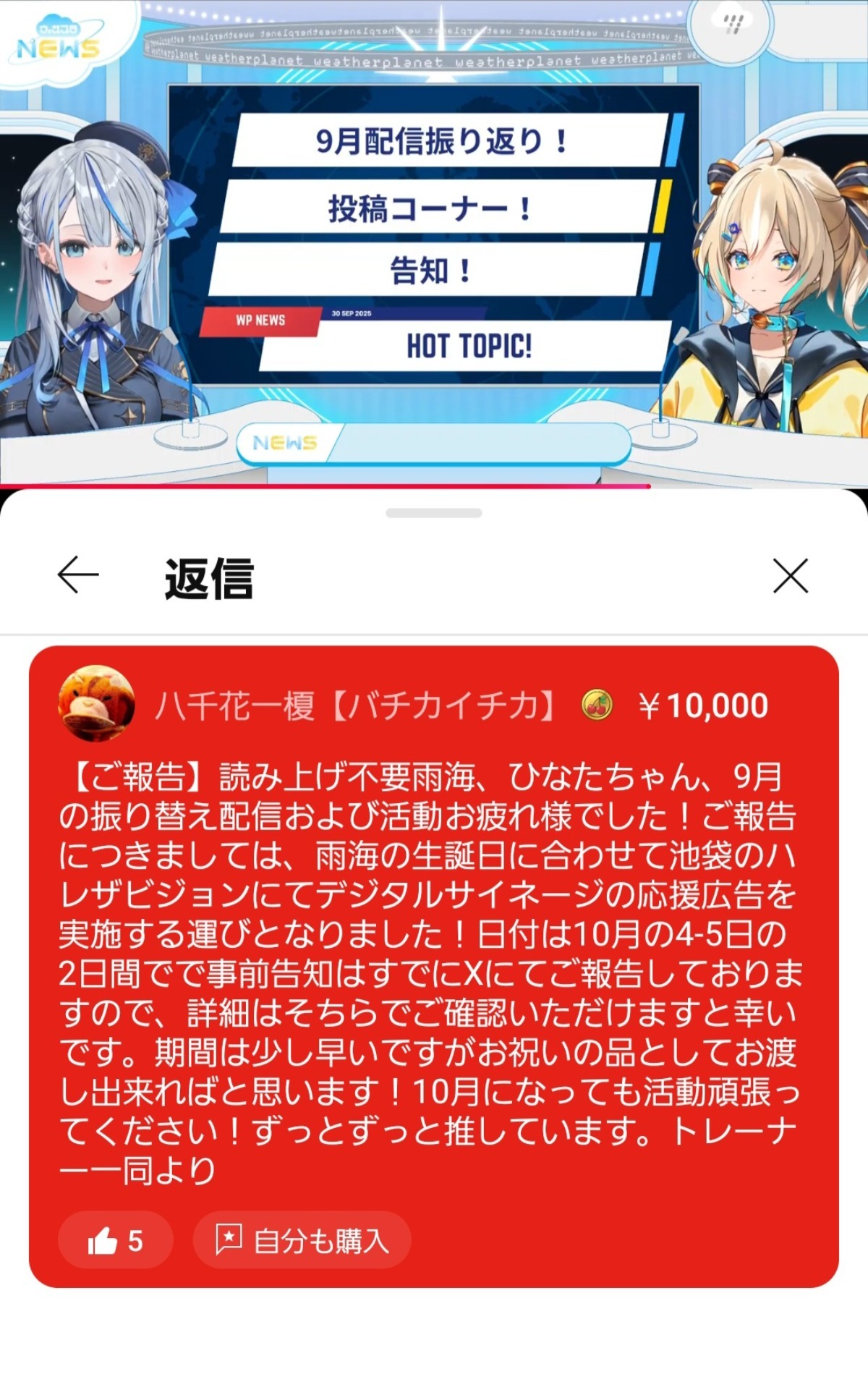 本日、9月を振り返る配信でスパチャにて報告したことをご連絡いたします。