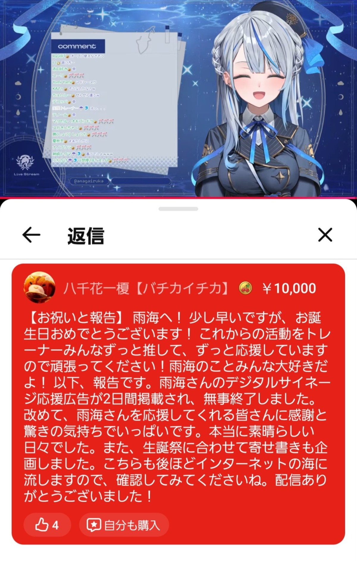 こちら寄書き企画の報告と合わせて応援広告無事完遂の報告を明日の枠にスパチャで雨海に報告します。