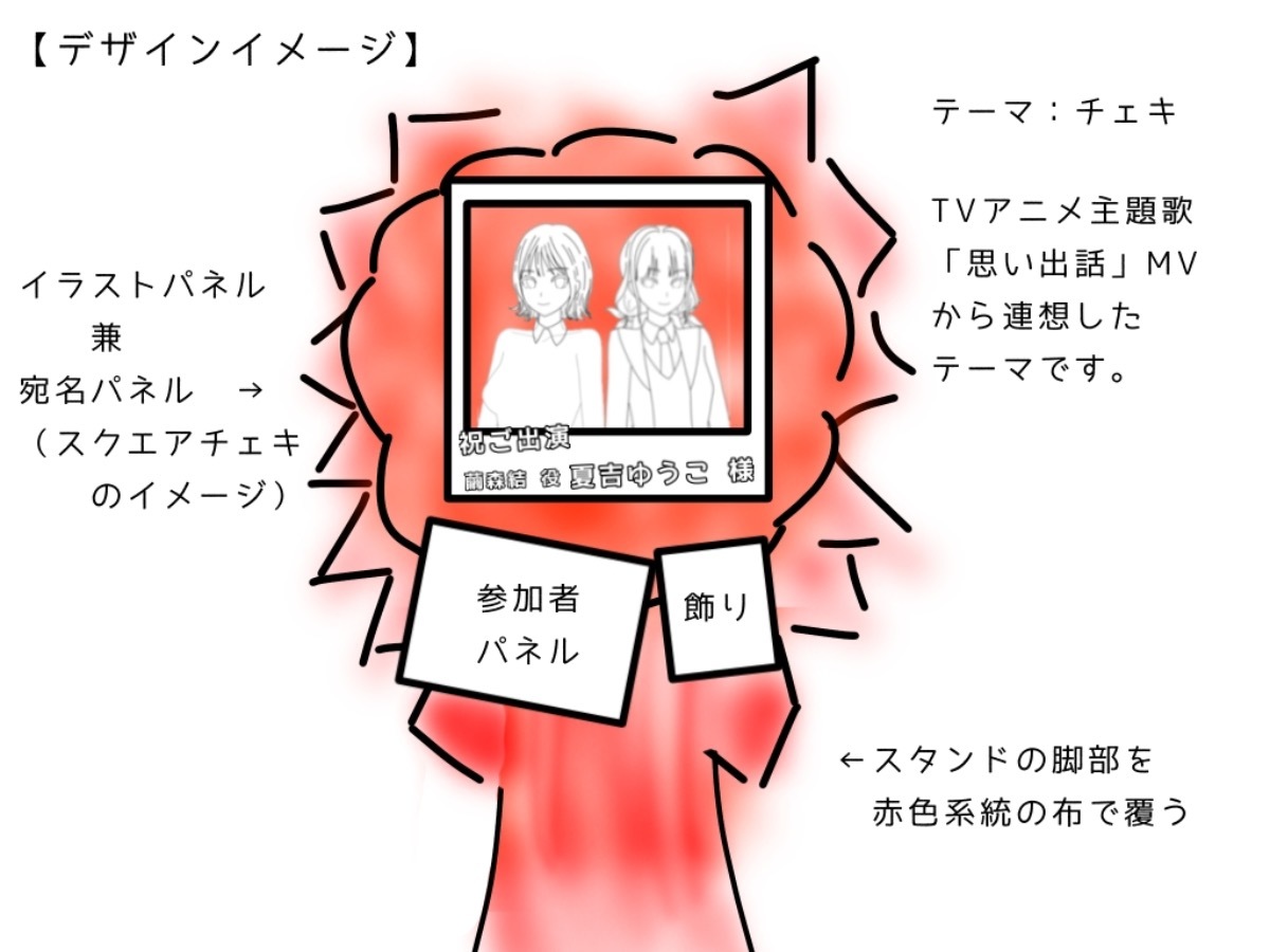 繭森結のカラーである赤色のお花を基調とし、イラスト付きのパネルやご参加いただいた皆様のお名前を掲載するパネルを作成する予定です。 -