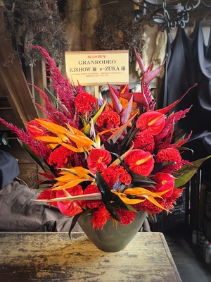 事例写真の背景に写りこむ、独特なアトリエの内装…。青山さんのアトリエはテーマパークかのごとく、とある人気ゲームの世界観で作り上げられています。そしてその内装に負けず劣らず、青山さんの作るアレンジもとてもユニーク。大胆な色使いと動きのあるアレンジは、お届け先様の印象に残ること間違いありません。