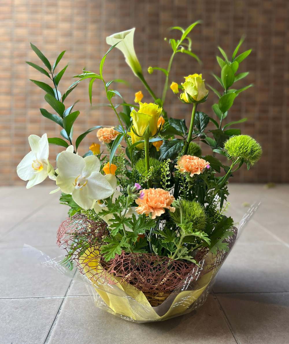 「花を贈るお相手の方を元気付けたい」という想いをのせたアレンジメント。生き生きと伸び伸びと、花の力を最大限に引き出すよう仕上げました。お客様のご要望に応じた花材や色味・形などご相談の上、ご準備させていただきます。
