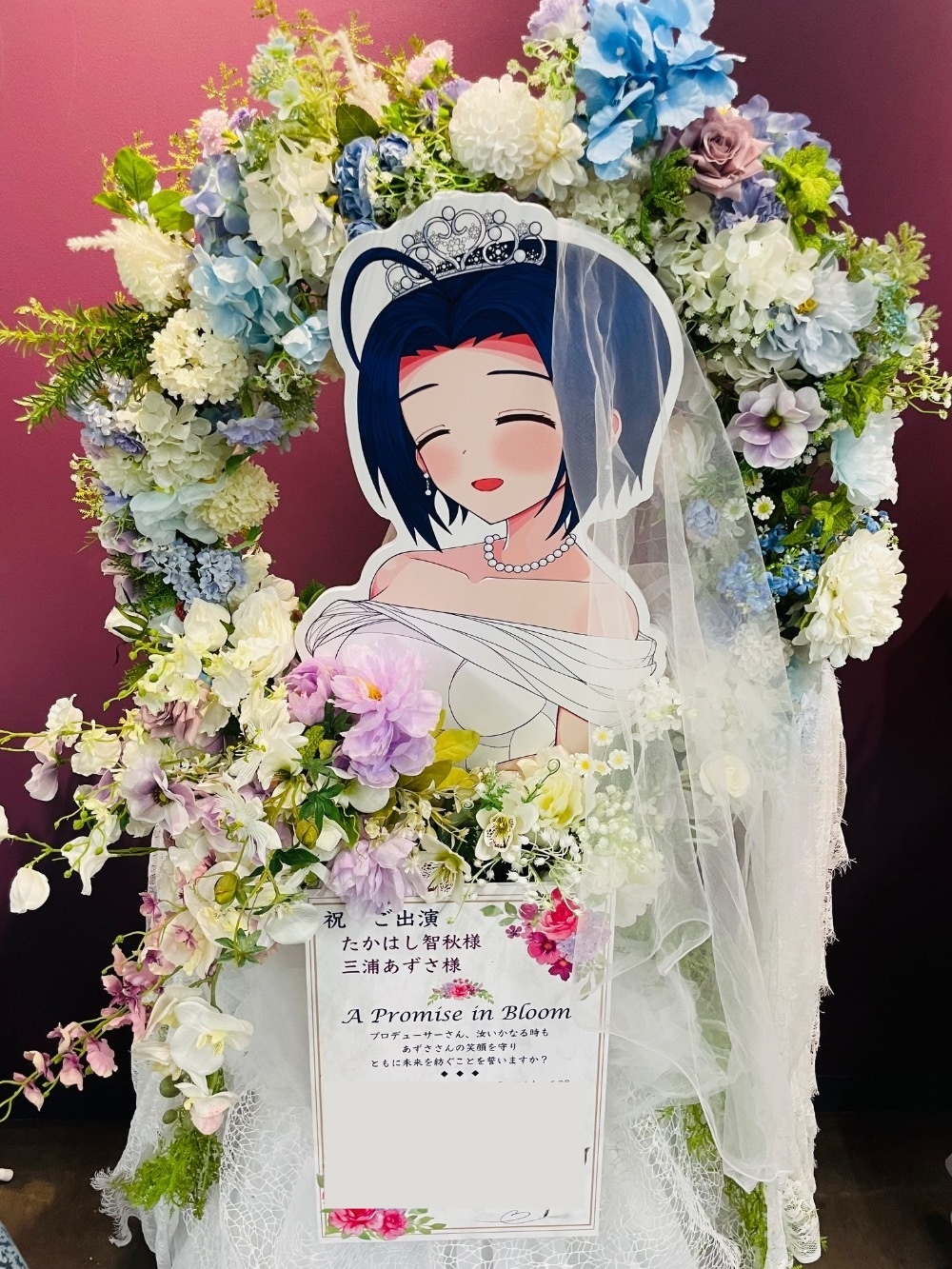 アーチ状のお花はウェディングアーチをイメージしてブルー〜ホワイトのグラデーションで、手元のブーケはキャラカラーの紫でお願いしました。
