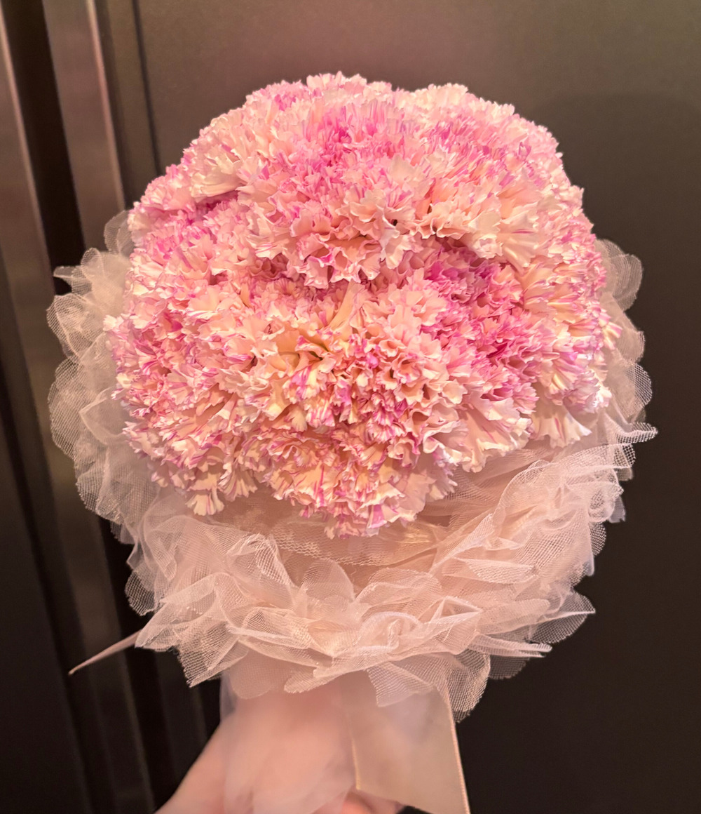メンカラピンクのかわいいふわふわオーガンジーのラッピングでかわいすぎる花束