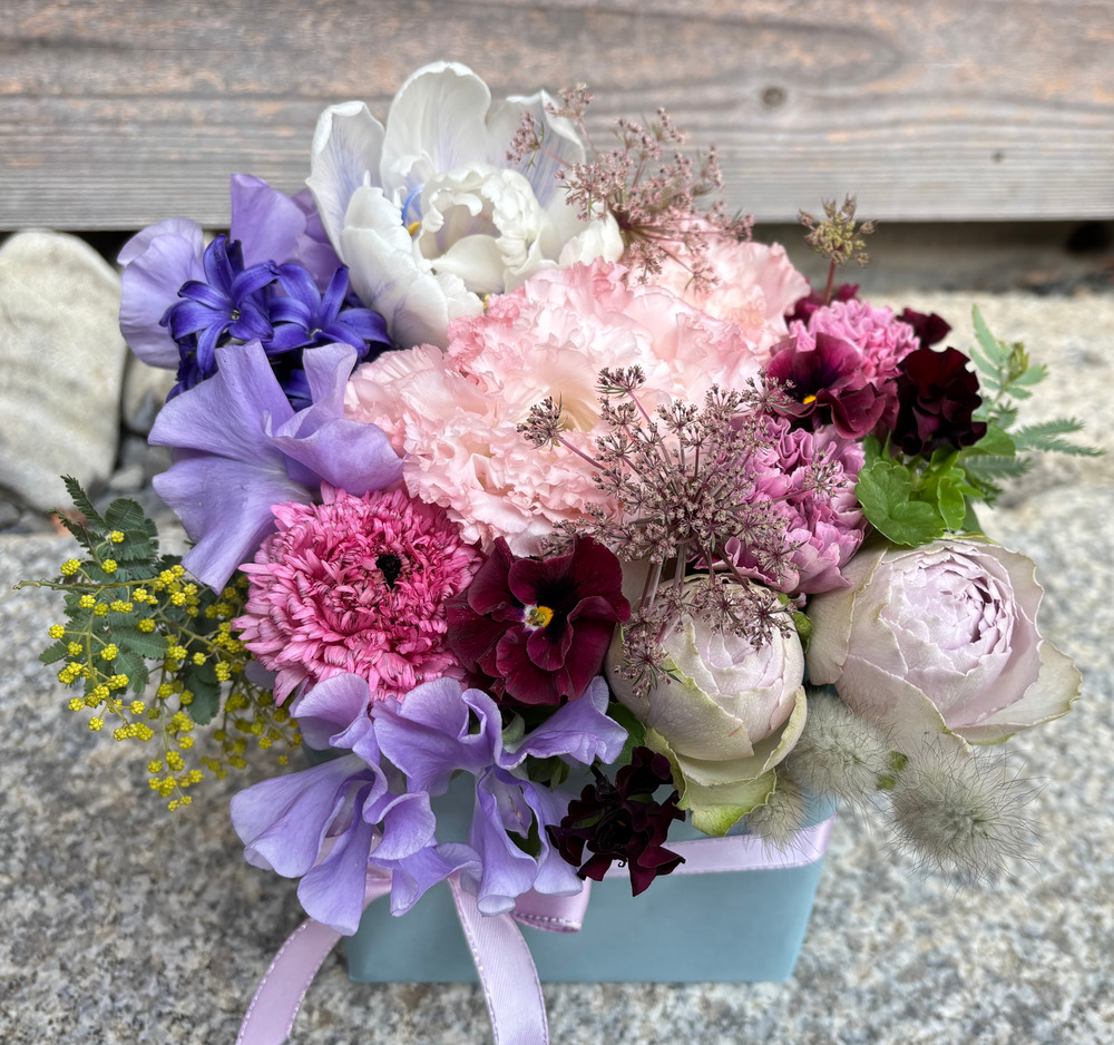春のお花をたっぷりとつかって、シックかわいいアレンジメントをお作りしました。