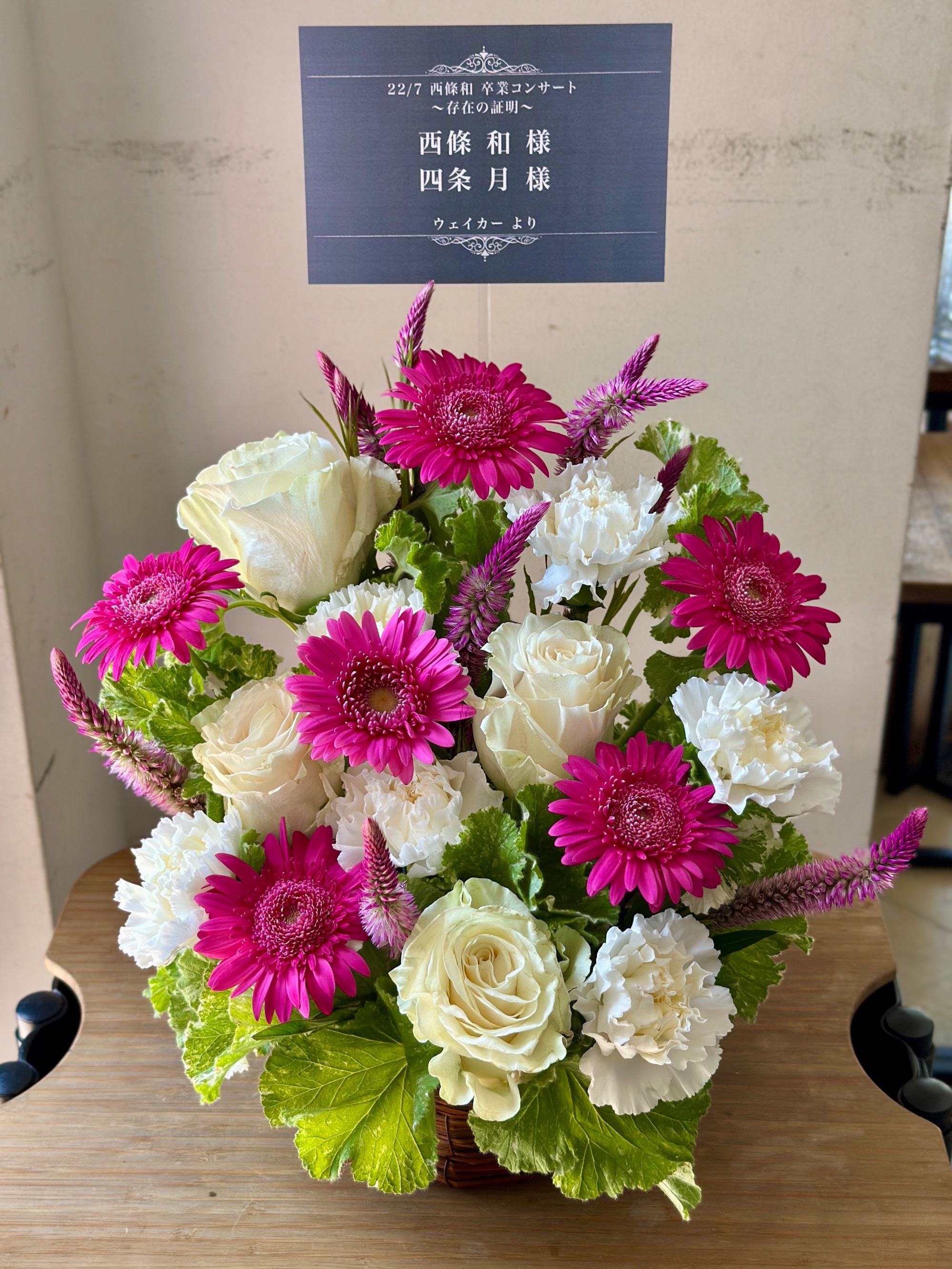 メンバー2人に宛てたお花という事で、それぞれのメンカラである白とマゼンタをベースに、できるだけ自然に明るくなるようお願いしました。