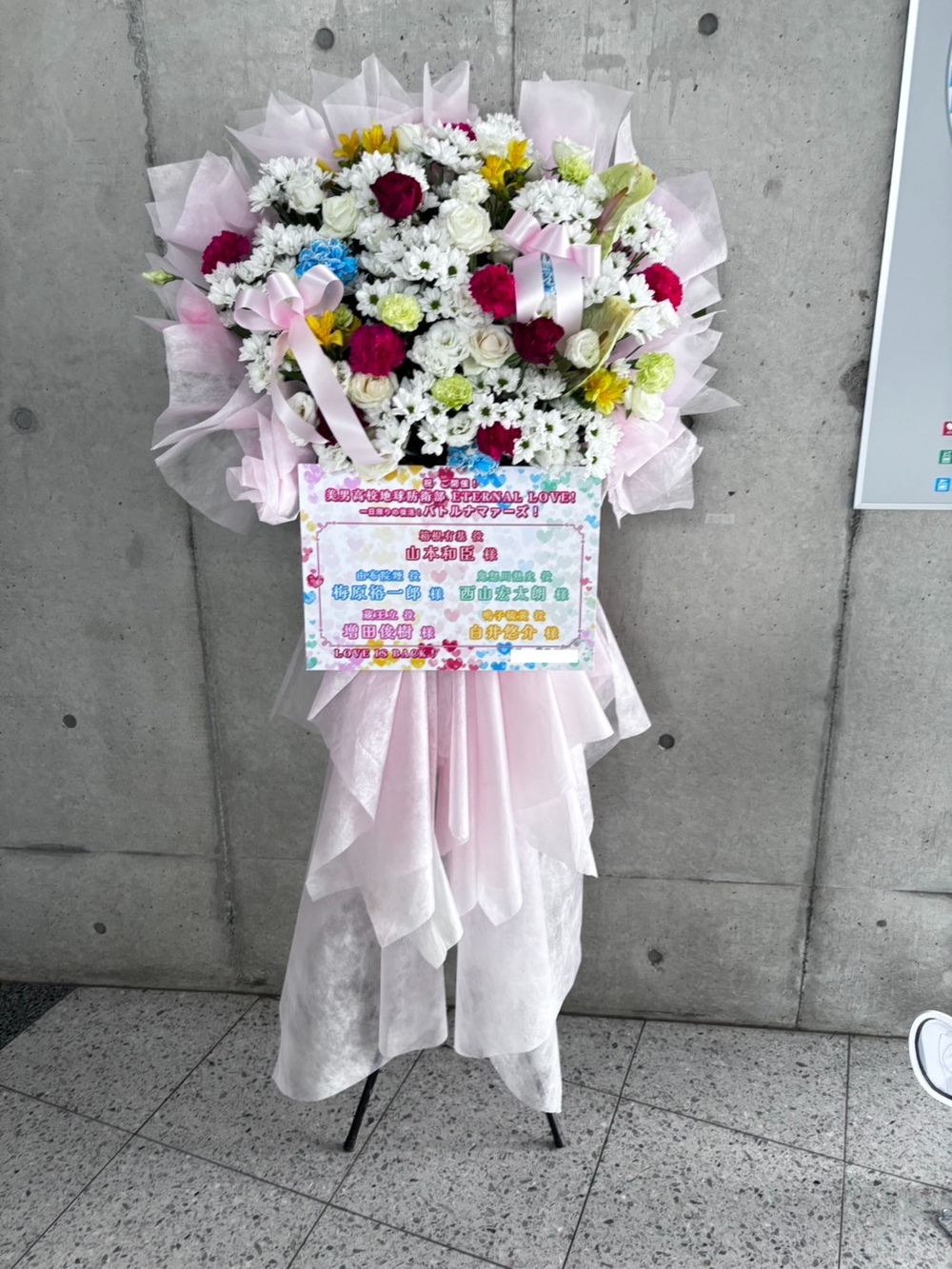 白をベースにそれぞれのキャラカラーを散りばめたところと薄ピンクのリボンをお花の中に入れているのがポイントです。また、イベントのビジュアル絵に書かれている花束のように花束風のフラスタにもこだわり、柔らかくも豪華な感じに仕上げて頂きました。