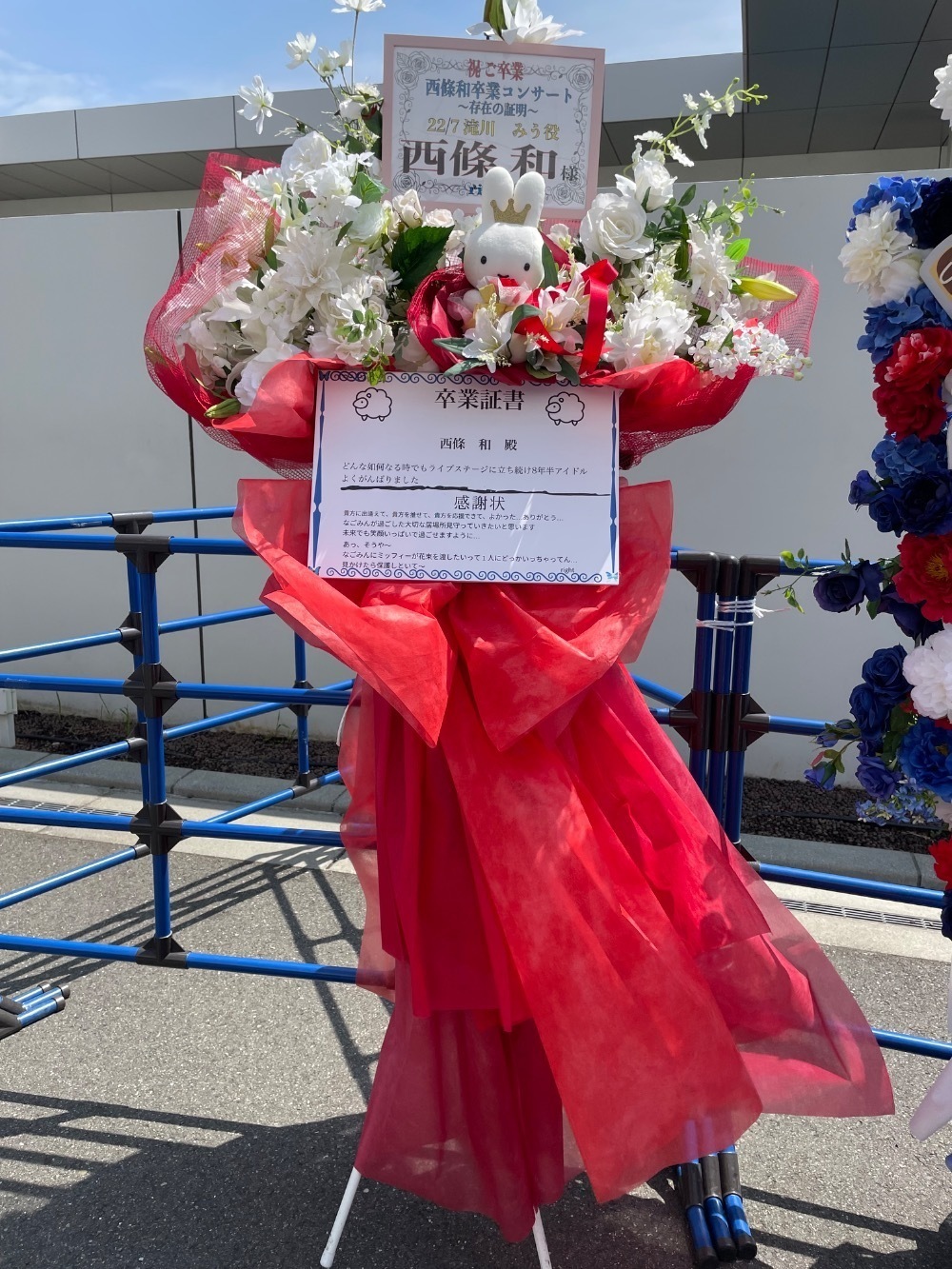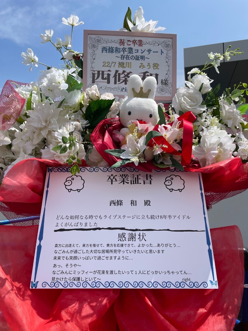 白い花は推しのペンライトカラー、赤い布で花のラッピングとドレス、花束の中にミッフィーのぬいぐるみ、花束の下のパネルに卒業証書、感謝状、ミッフィーが花束の中にいる経緯