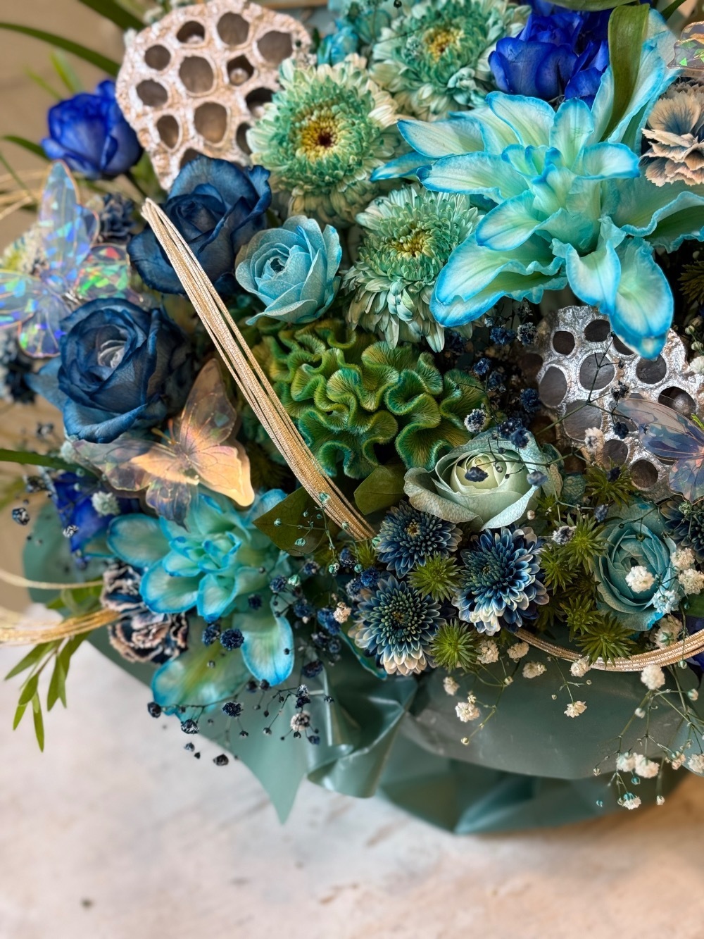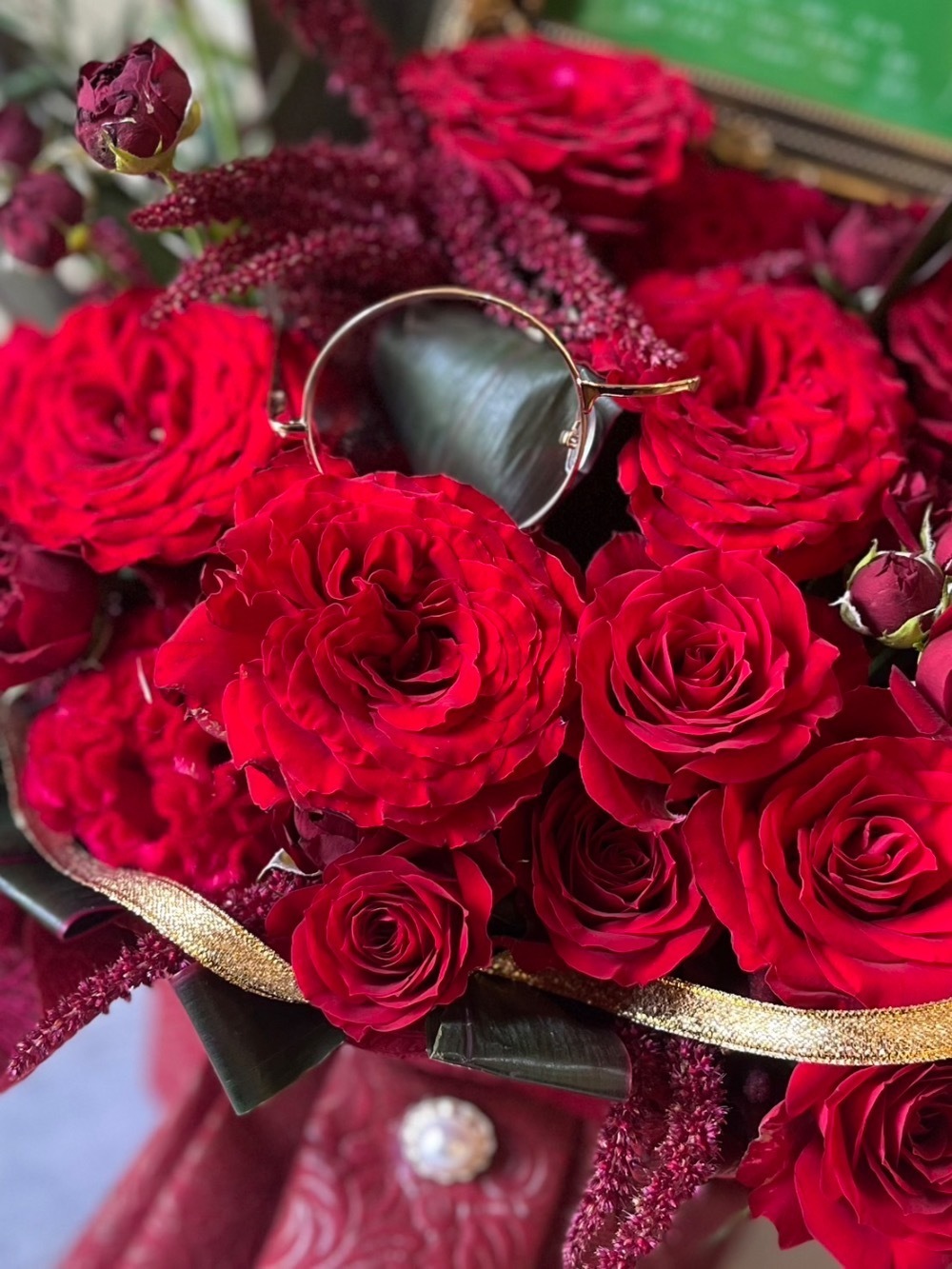 送りたい方推しの衣装やモチーフに合わせたものをオーダーしました。推しは赤いバラがモチーフにあるので、赤いバラををふんだんに使ってメインのお花として強調しただきました。