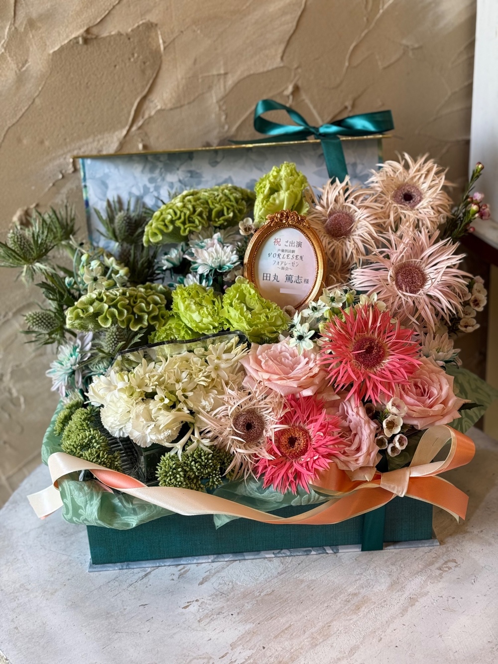 #18,000円 #公演・出演祝い #フラワーデザイナー牧 #楽屋花 #推し花 #白石市文化体育活動センター #田丸篤志 #声優 #声優朗読劇 #ボックスフラワー #オリジナル立て札 #リボン #ボリューム