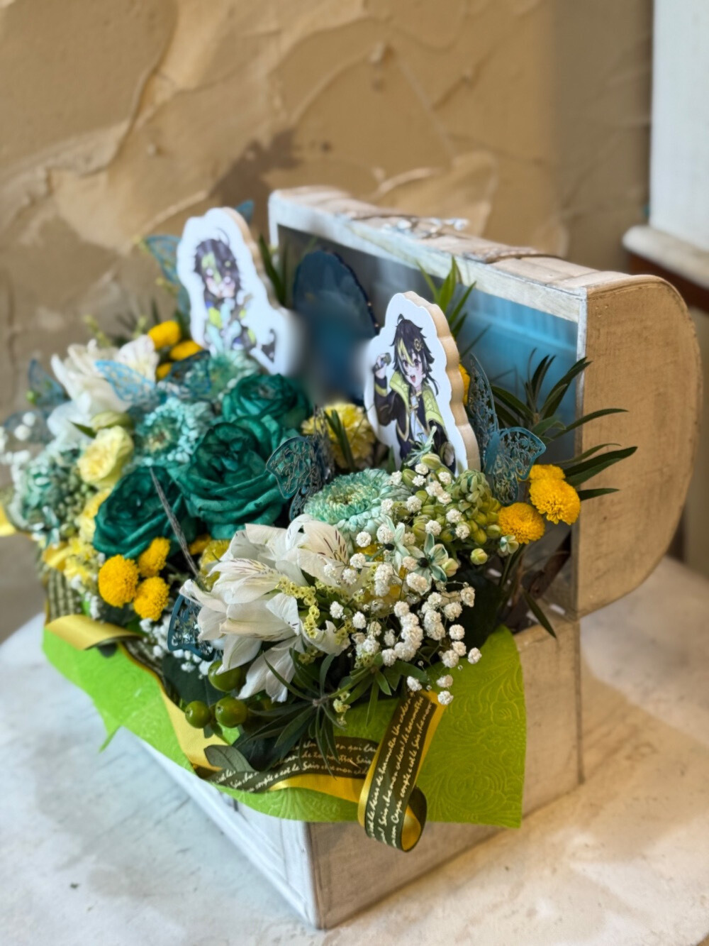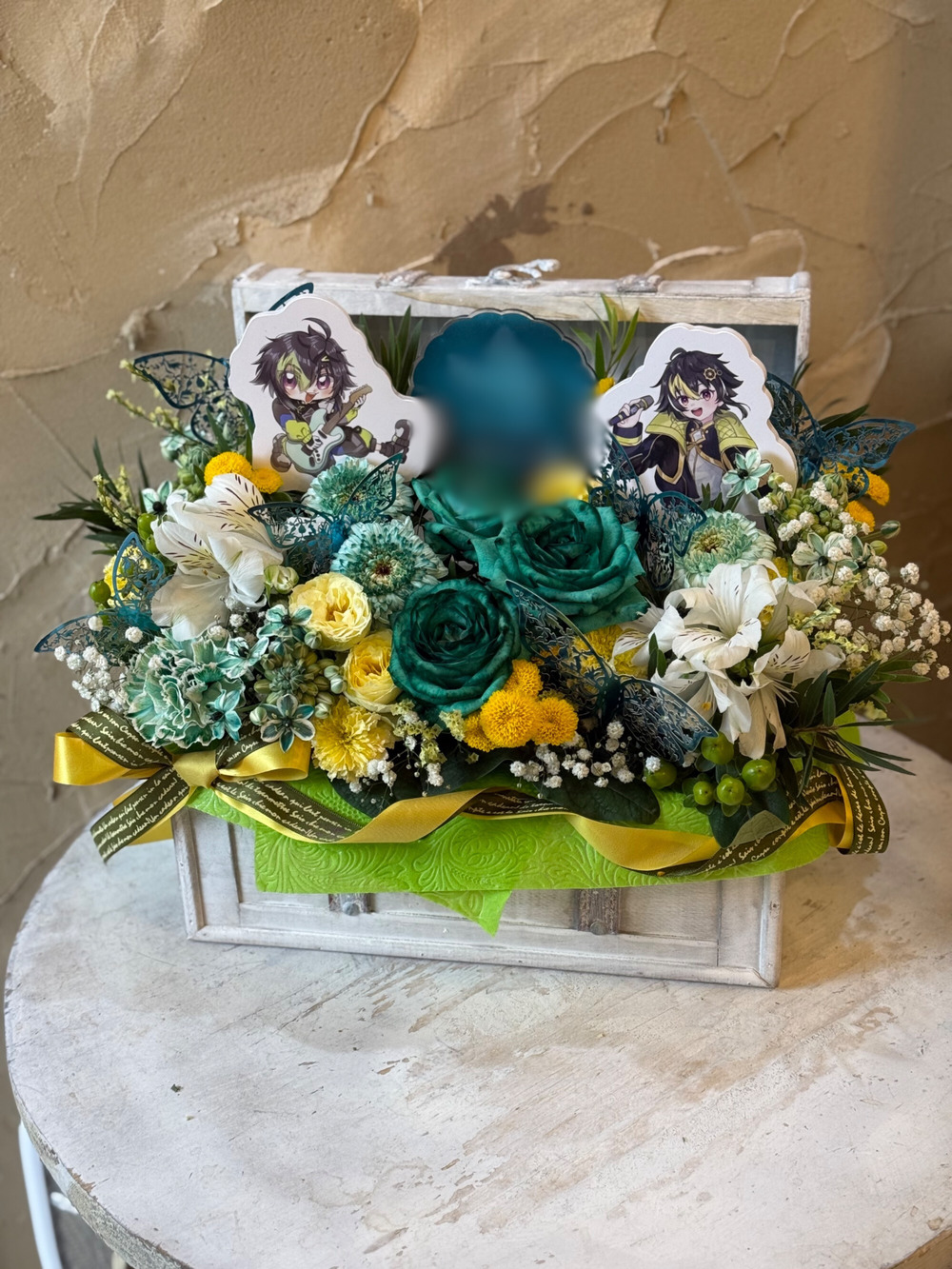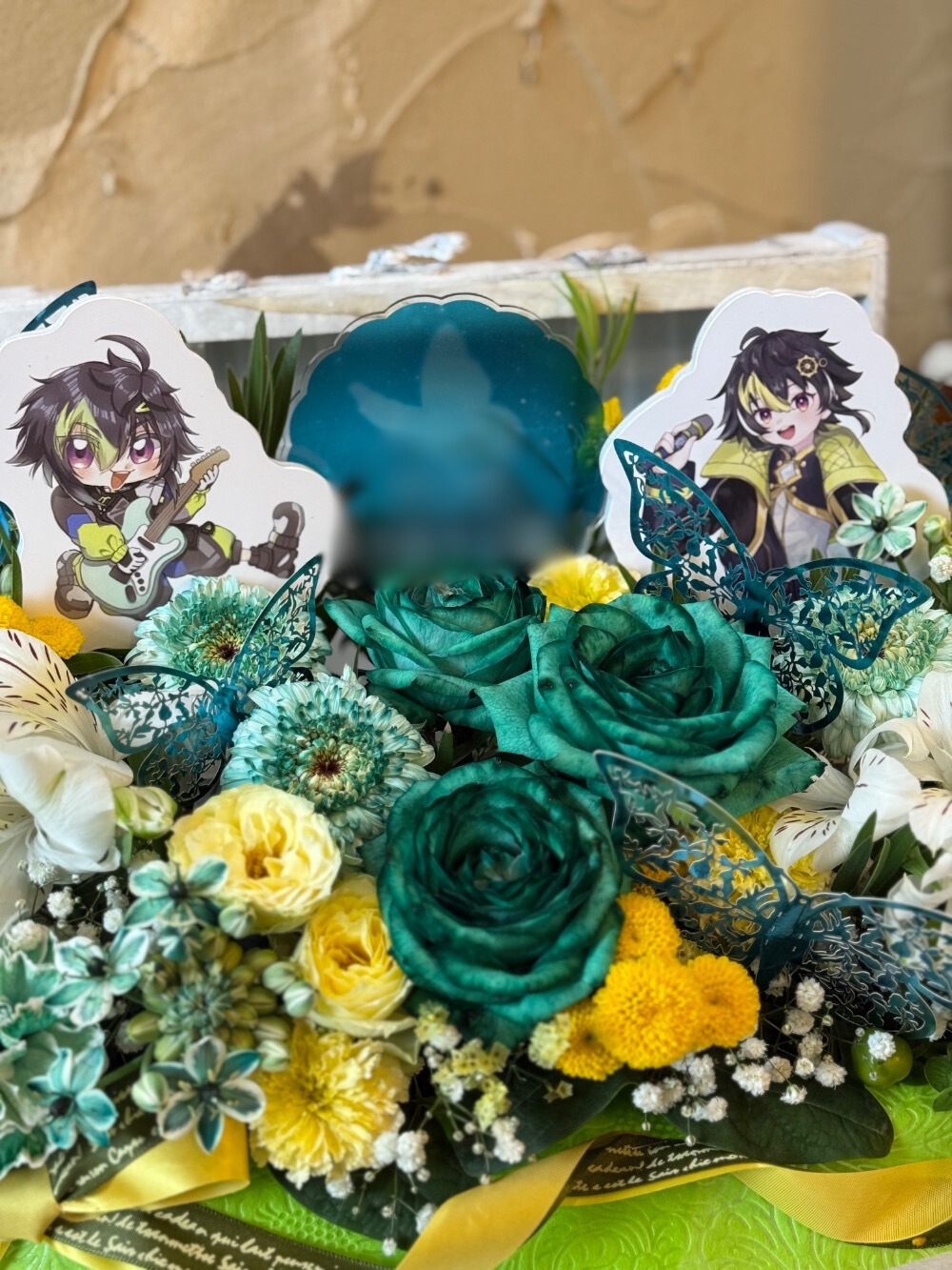 #16,000円 #公演・出演祝い #フラワーデザイナー牧 #グリーン #楽屋花 #推し花 #オリジナル立て札 #パネル装飾 #リボン